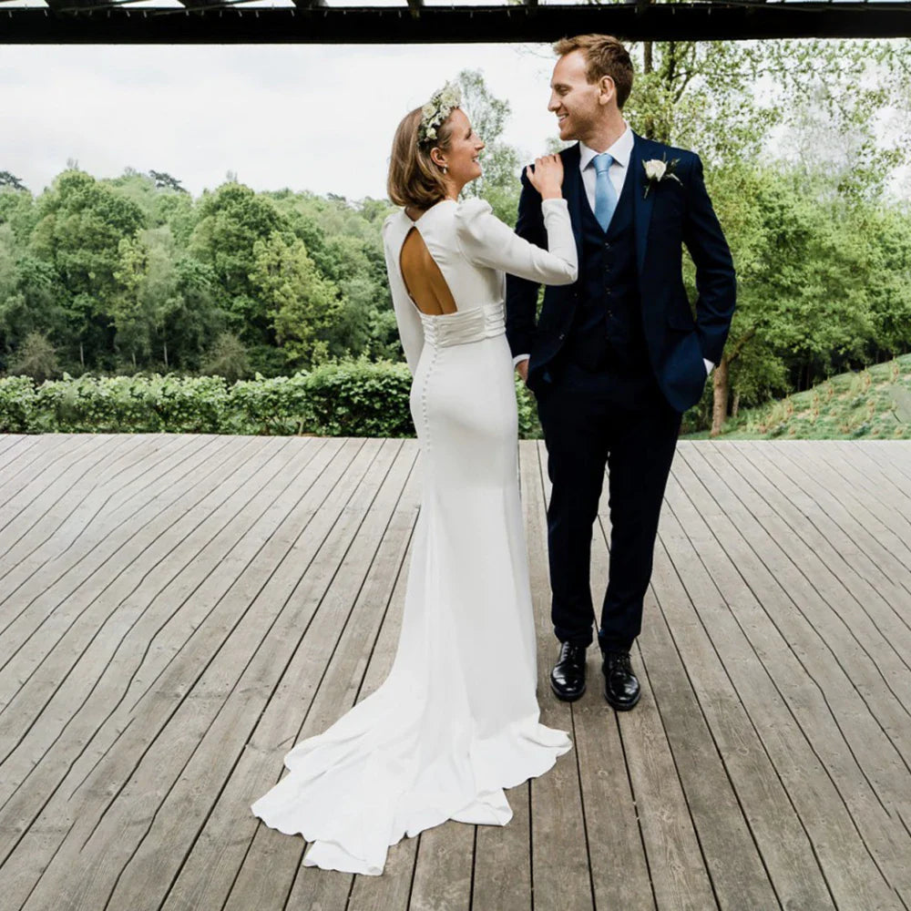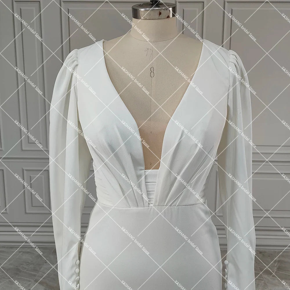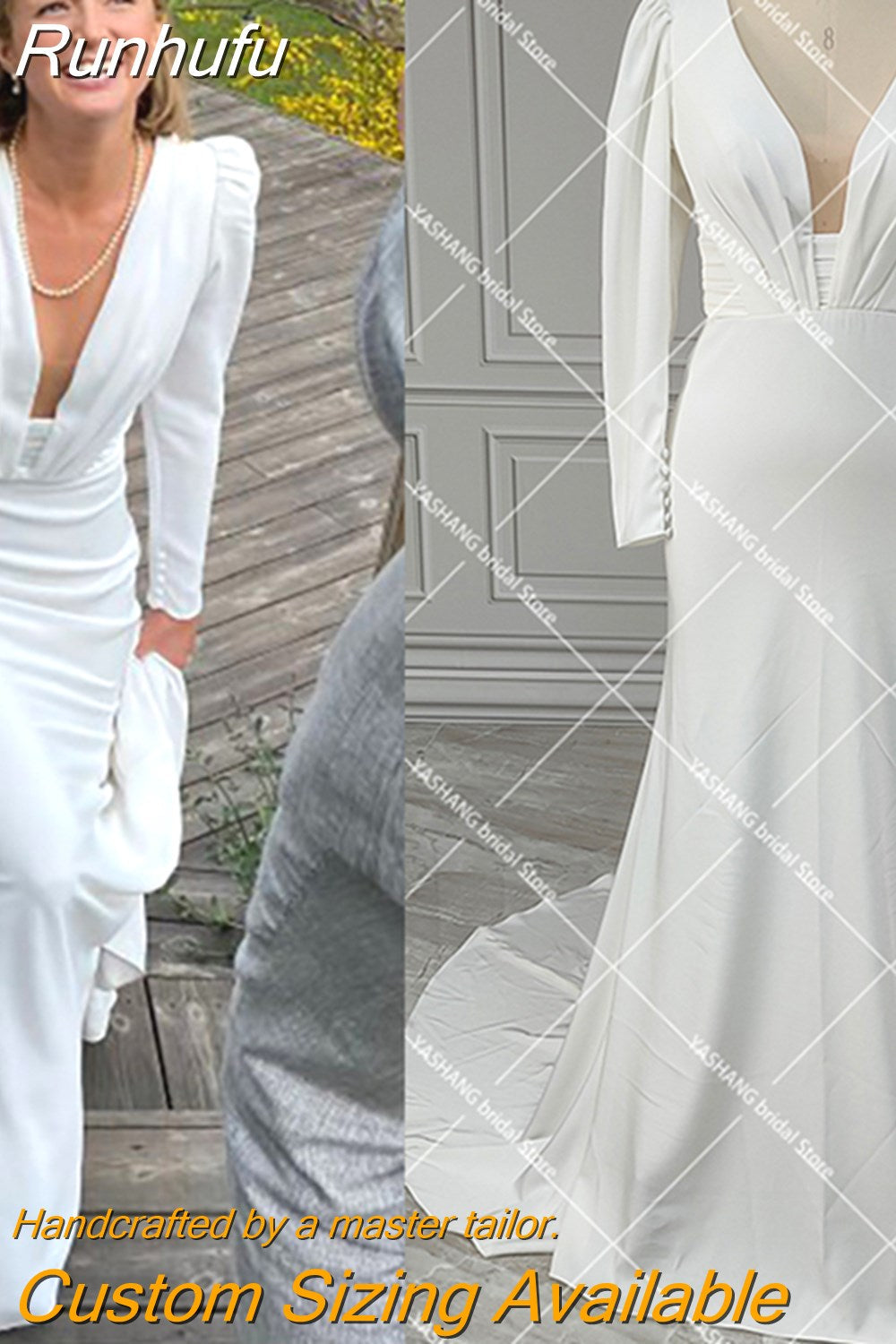 Runhufu Picture Deep V Neck Hollow Back Minimalist Wedding Dress Custom Made Sheath Buttons Ruched Satin Mermaid Bridal Gowns