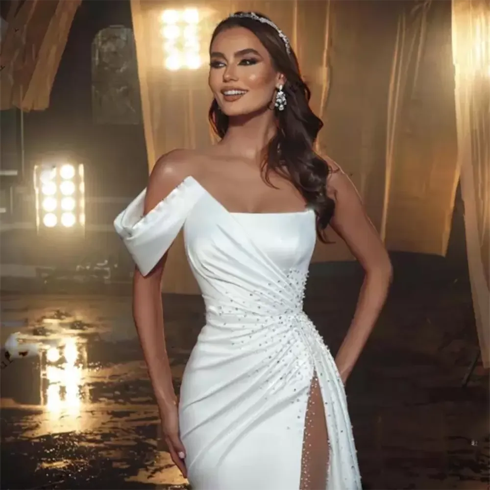 Runhufu Satin White Mermaid Wedding Dresses 2023 Thigh High Slits Bridal Gown One Shoulder Pearls Garden Robe de soiree de marige