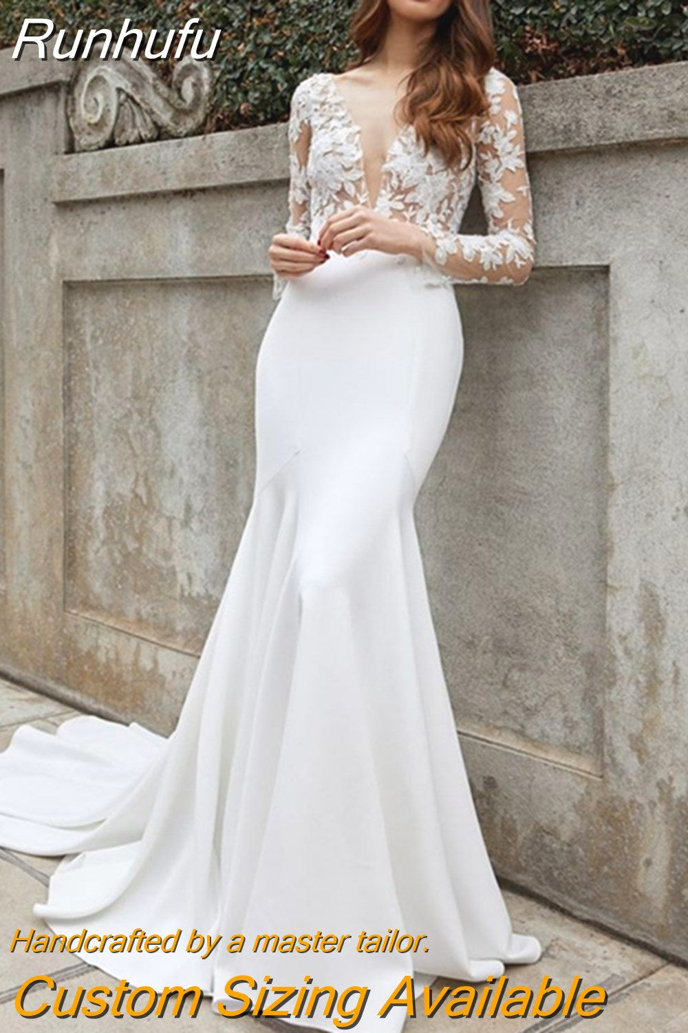Runhufu Sexy Deep V-Neck Wedding Dres Long Sleeve Backless Modern Mermaid Bride Gown Illusion Zipper Button Vestido De Novia