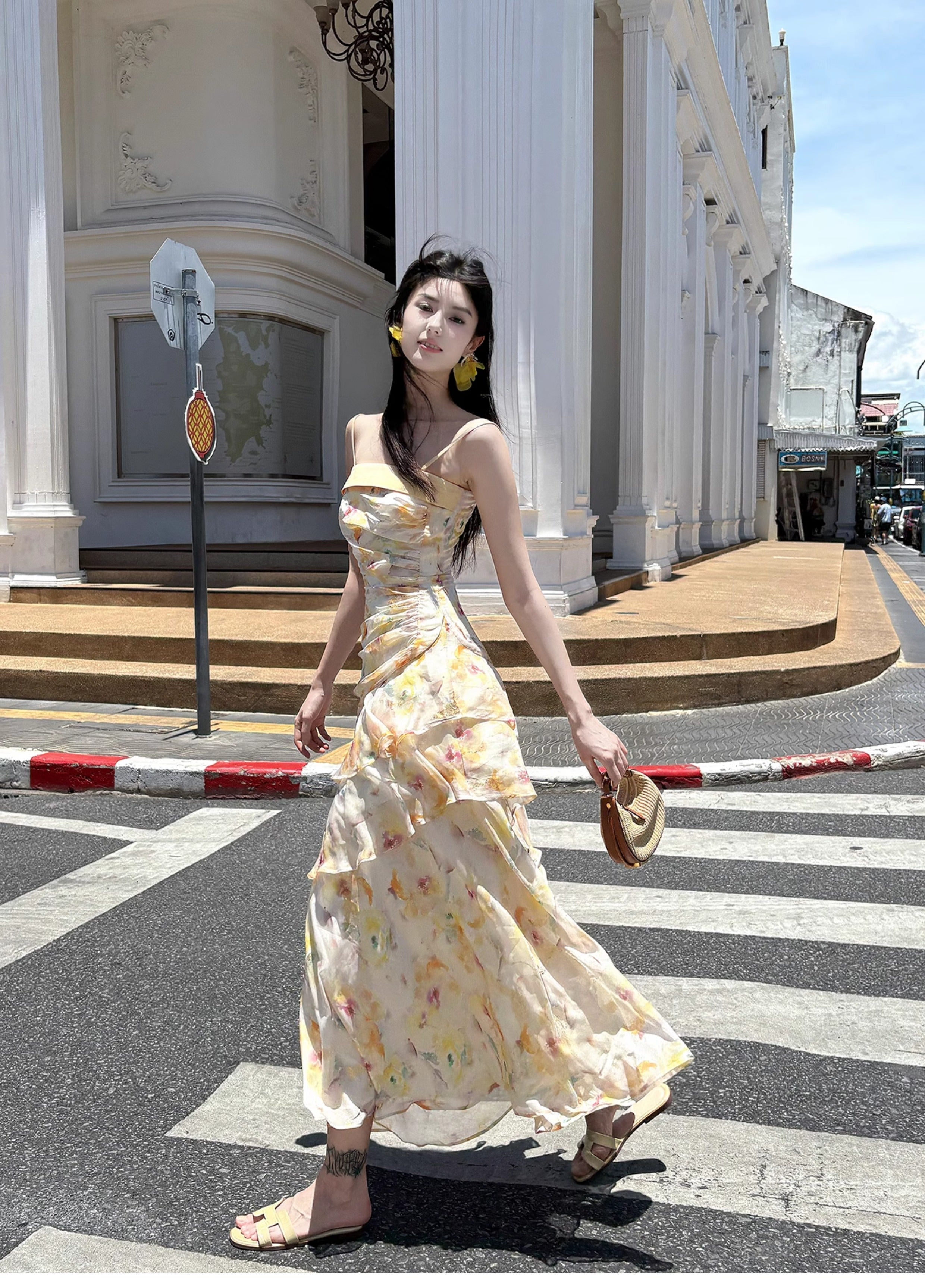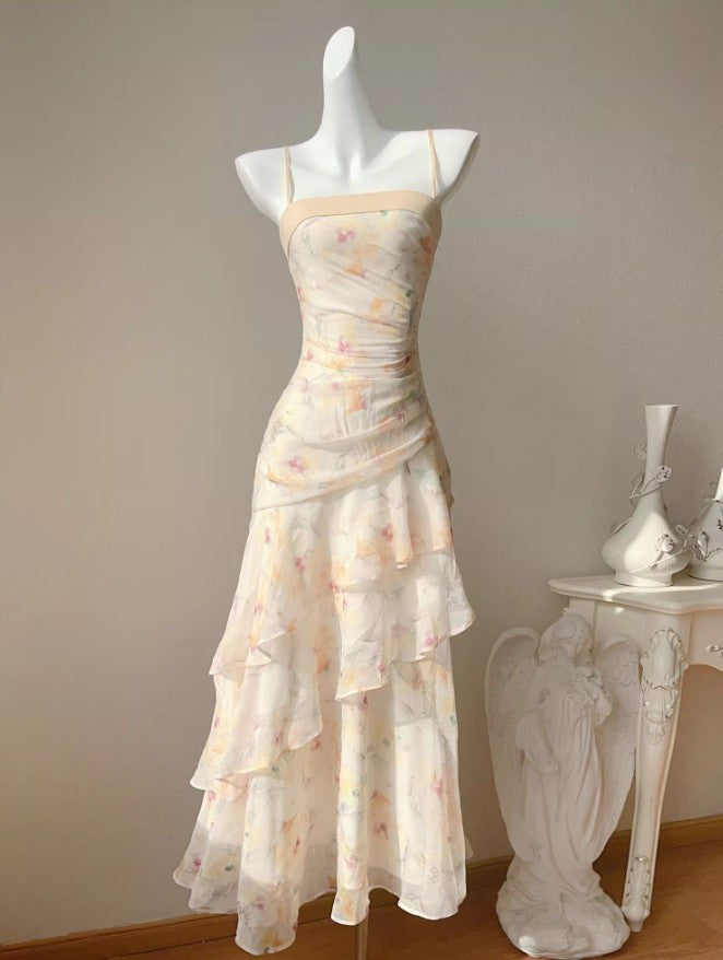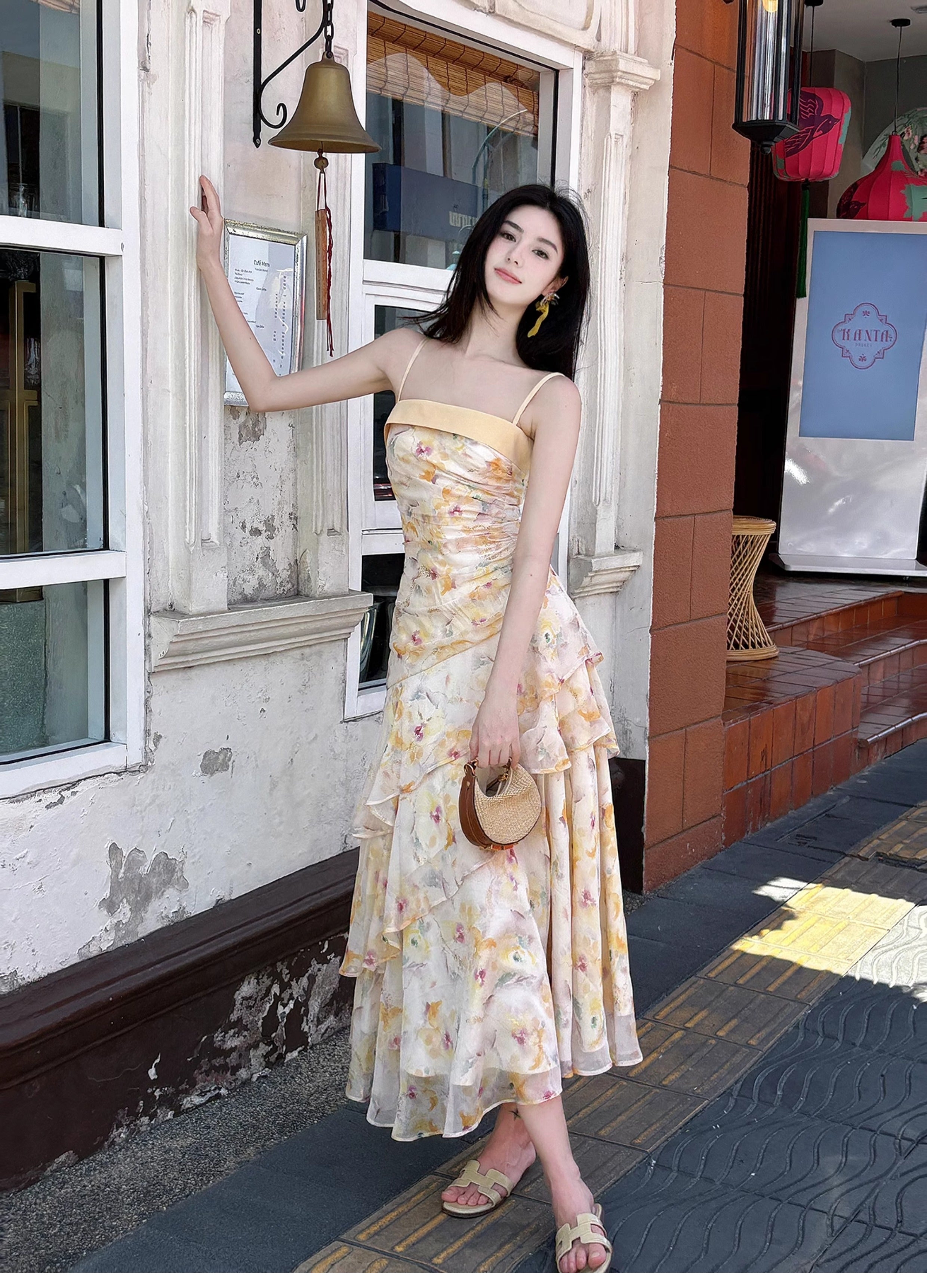Sweet French Ruffle Print Spaghetti Strap Dress Fashion Mermaid Party Dress HZ1108