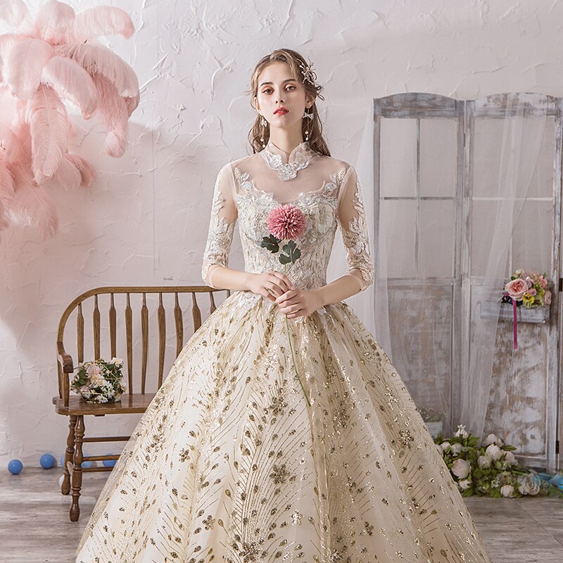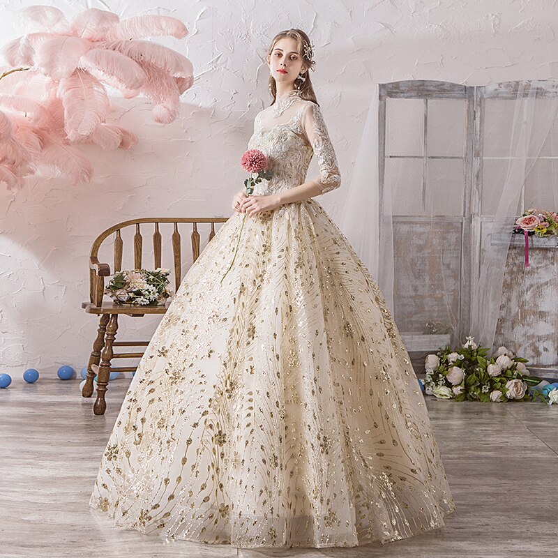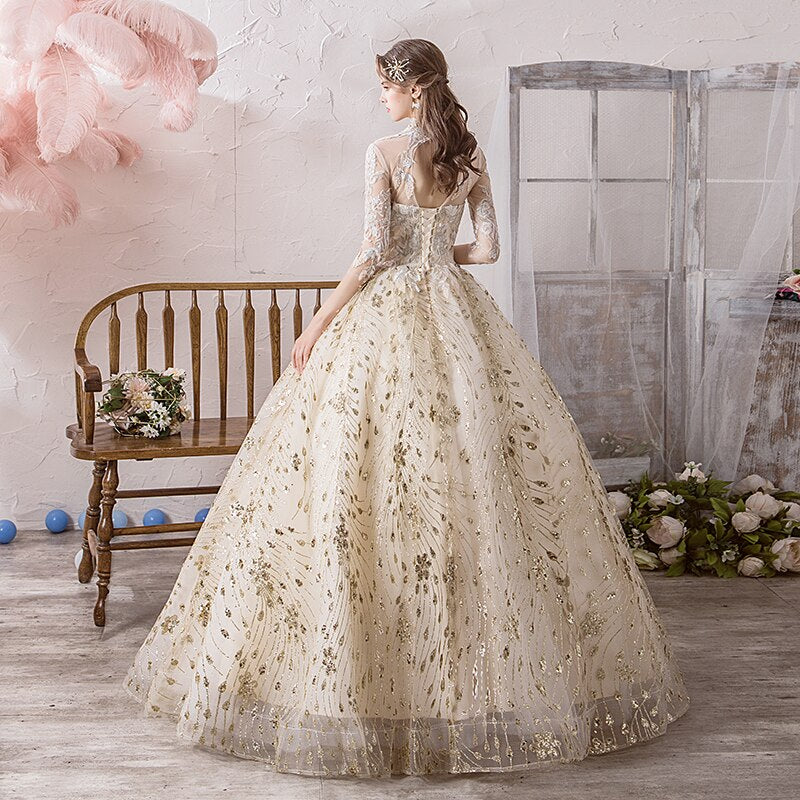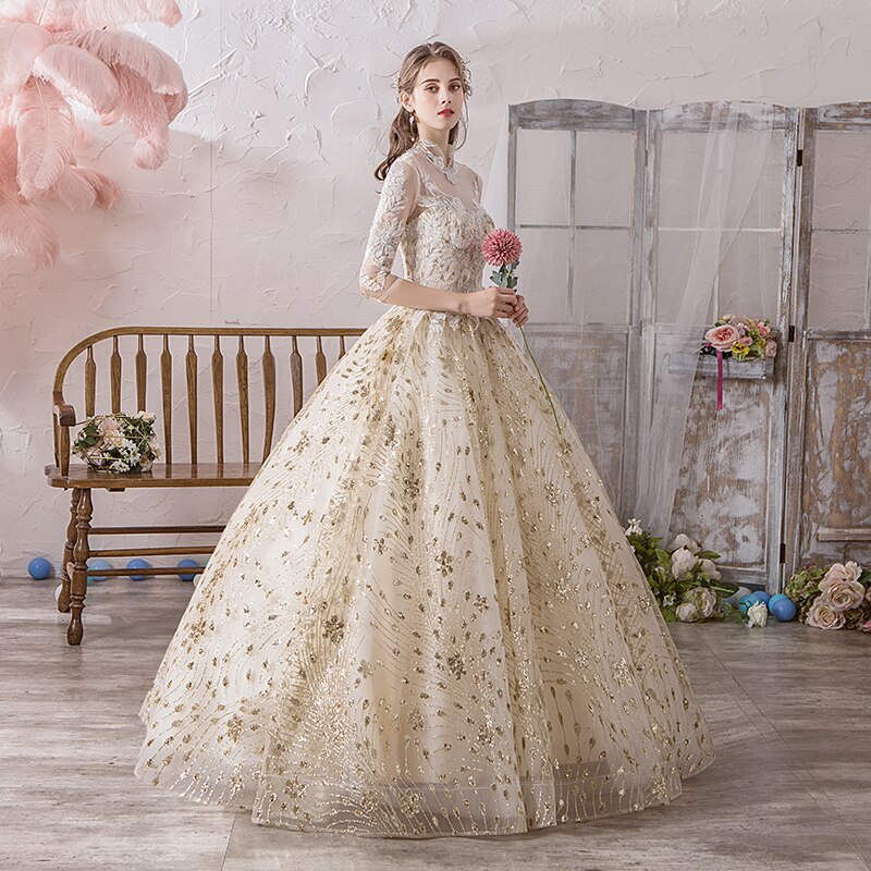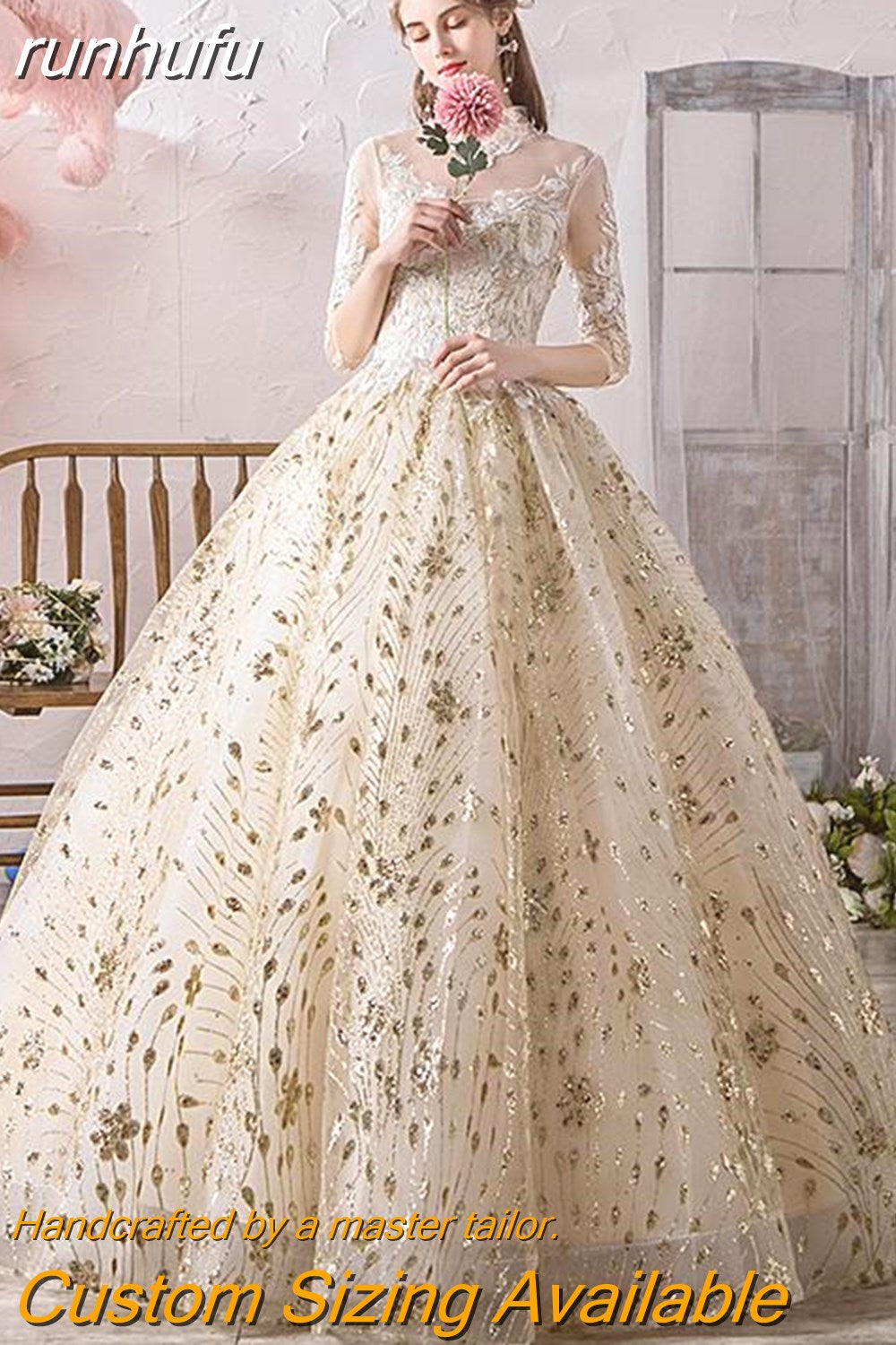 runhufu Dress 2023 Muslim Half Sleeve High Neck Lace Up Ball Gown Princess Champagne Vintage Wedding Dresses Hs778