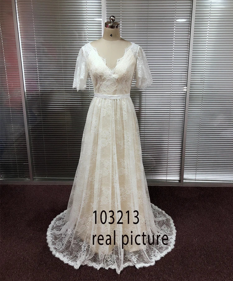 Runhufu Lace V-neck A-line/Princess Train Brush Bohemian Wedding Dress Butterfly Sleeve Nude Bridal Dress with Color