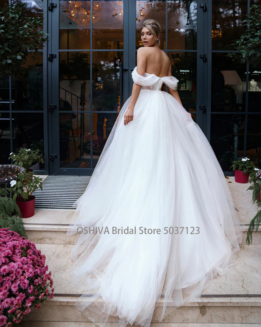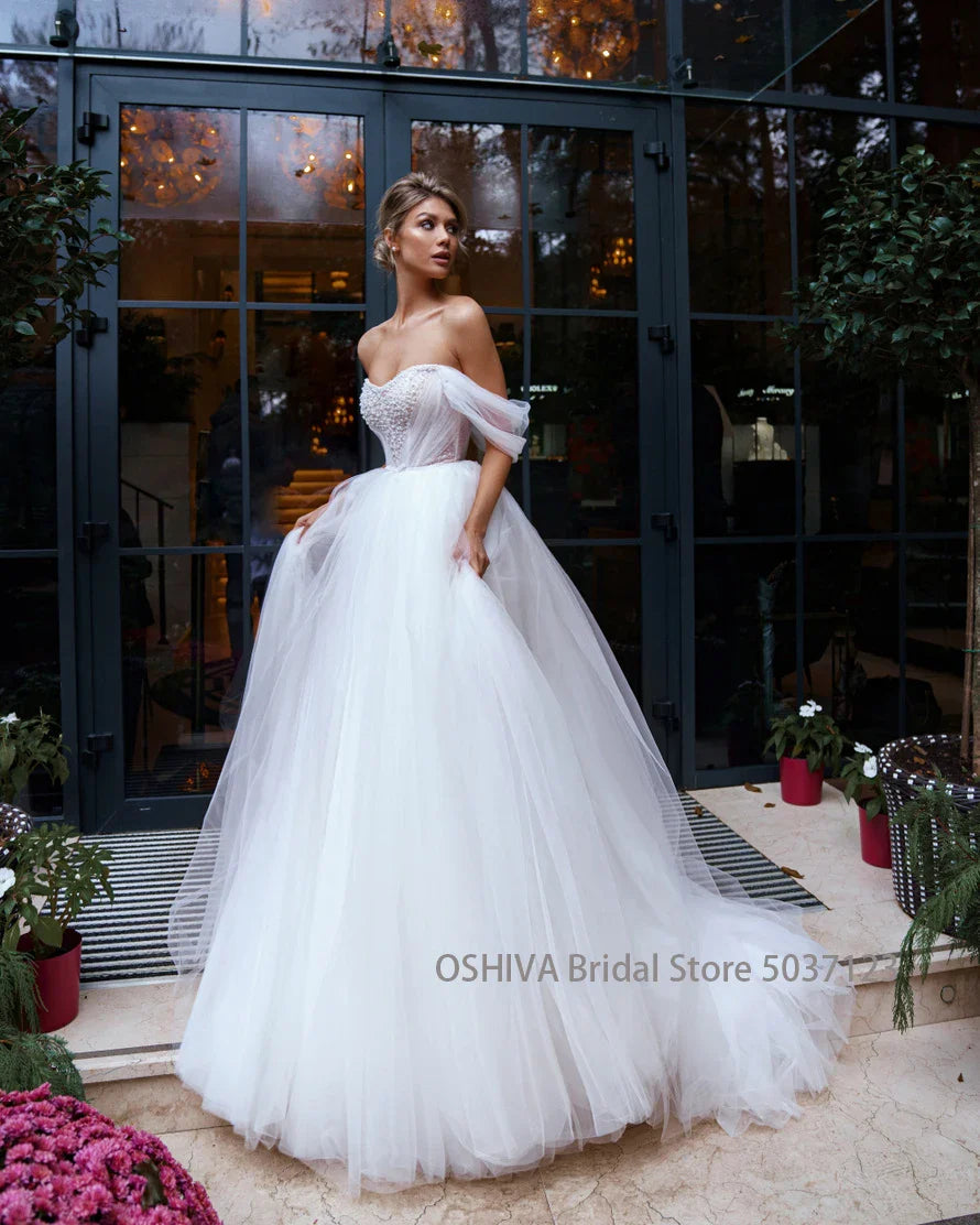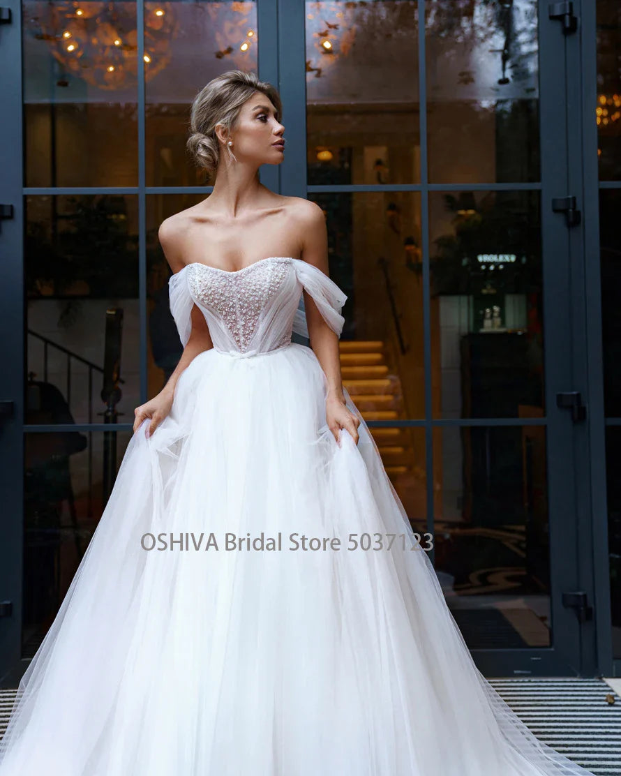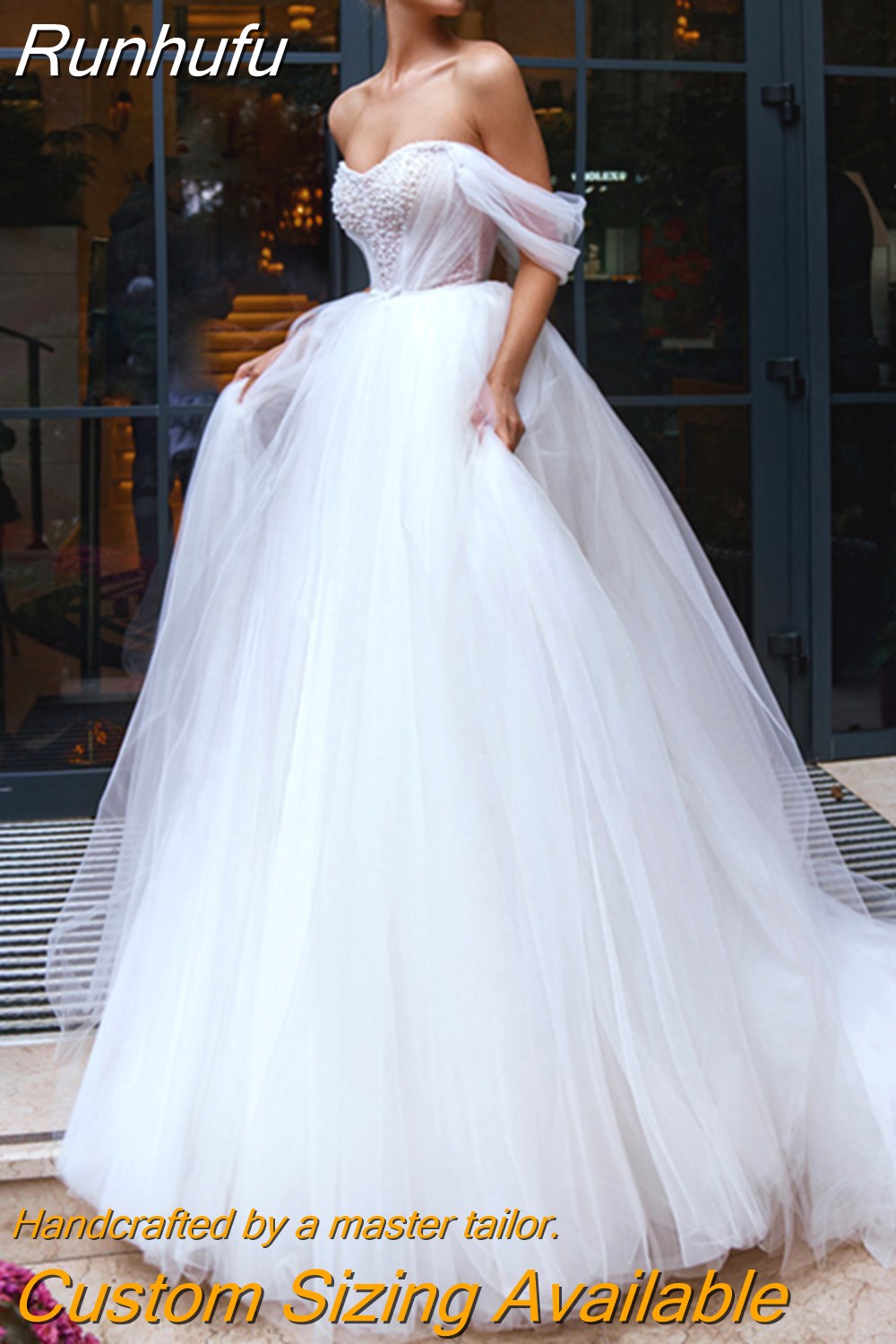 Runhufu Puffy Tulle Princess Wedding Dresses Off Shoulder Beading Sweetheart Short Sleeve White Ball Gown Vestido de Noiva