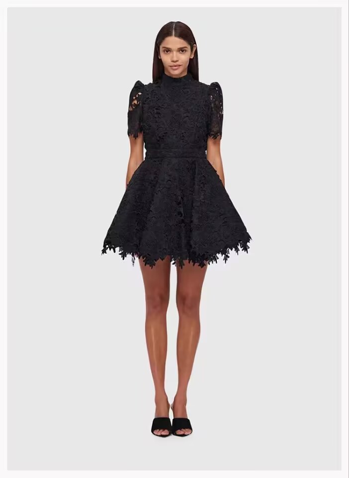 runhufu Fluffy Miniskirt 2024 Early Spring Collar Short Sleeve With Belt Water-Soluble Lace Dress Skirt