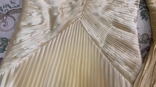 It is beautiful, I loved it... it is so beautiful the details of the chest part, I asked for it in white color and it is not very different from ivory.