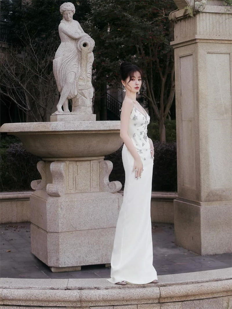runhufu Shuxin's Design Of The Same Water-Drilled Sling Dress Female Senior Sense V-Neck Body Banquet Bag-Gown Dress Dress