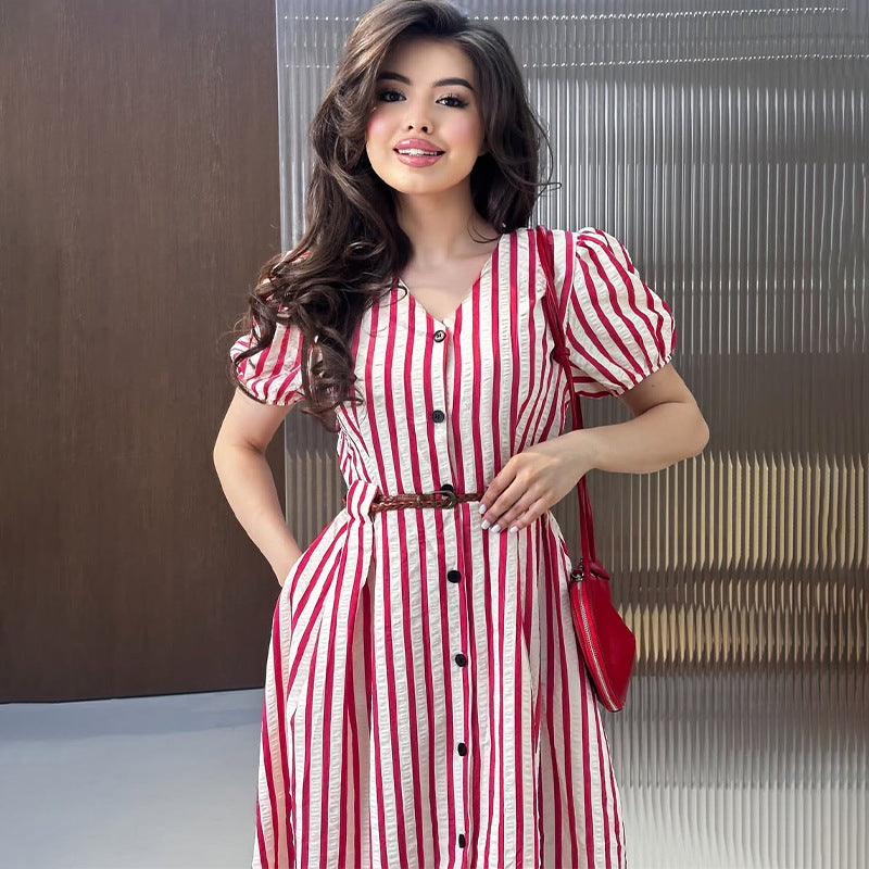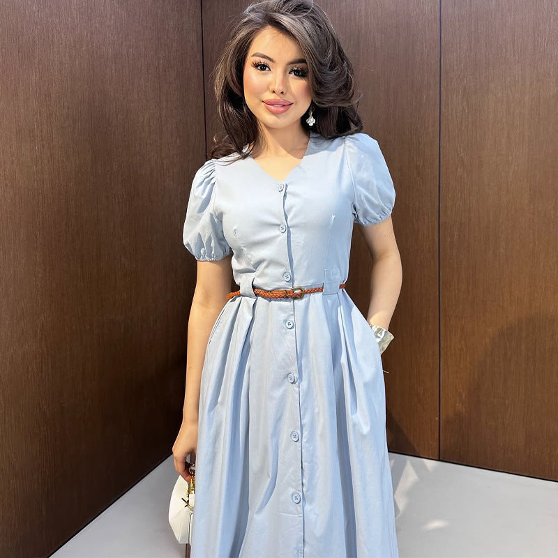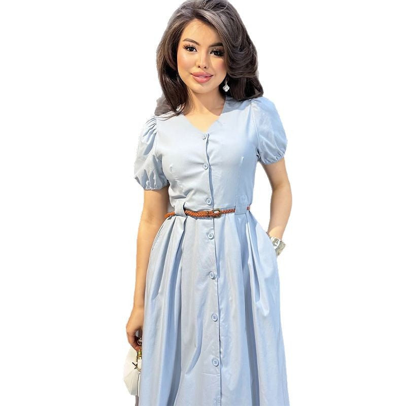 runhufu Solid-Color V-Neck Short-Sleeved Multi-Button Belt Casual Dress In Autumn 2025