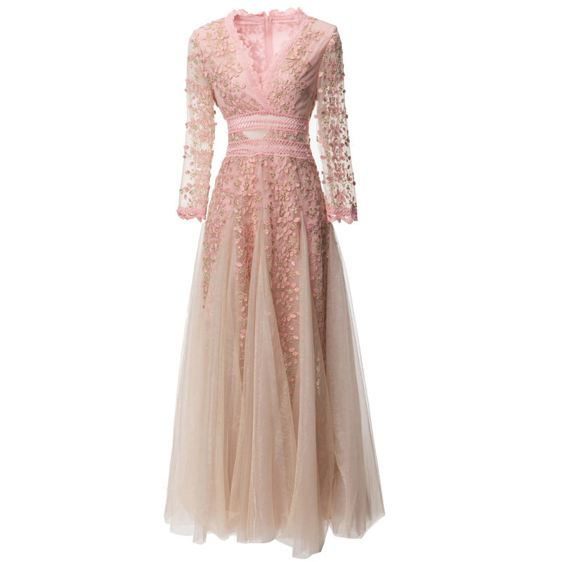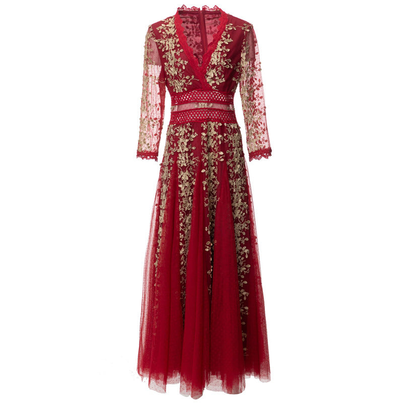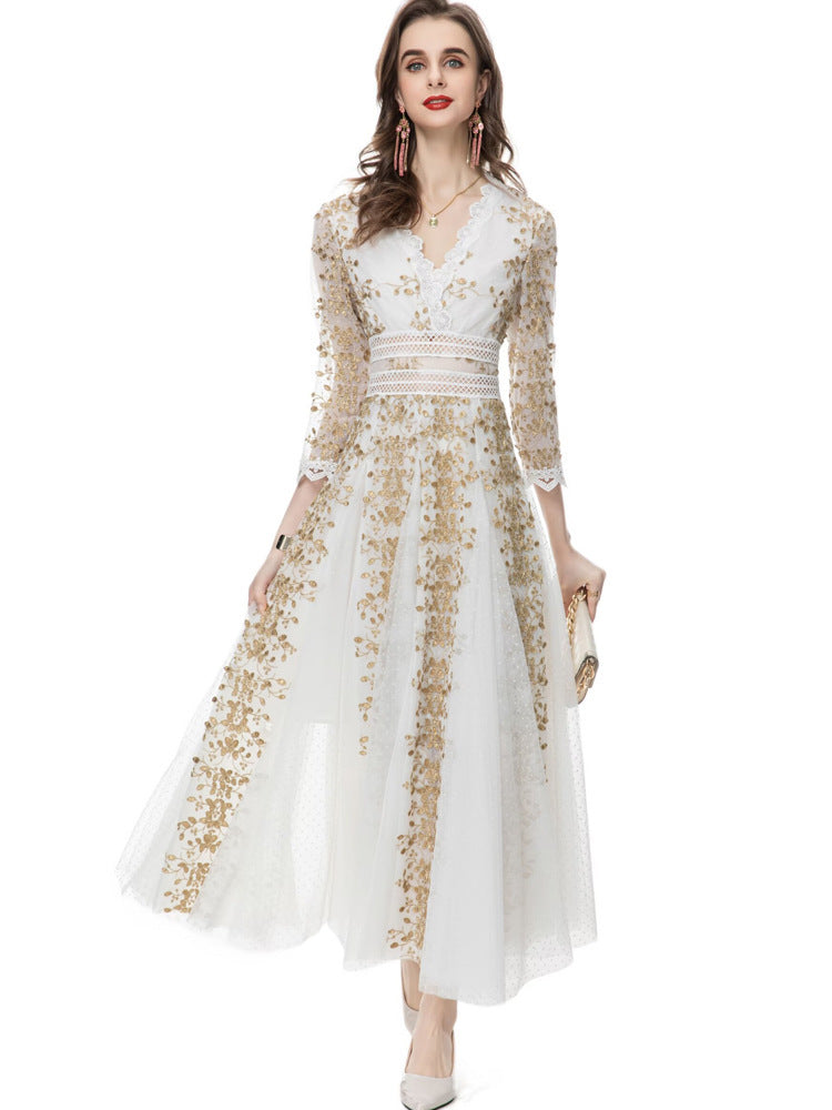 runhufu V-Neck Seven-Sleeve Embroidered Mesh Dress Dress Spring And Summer Women's New 2024