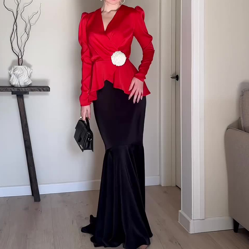 runhufu Women's Dress French Style Dress V-Neck Sexy Temperament With High-Rise Half-Body Skirt