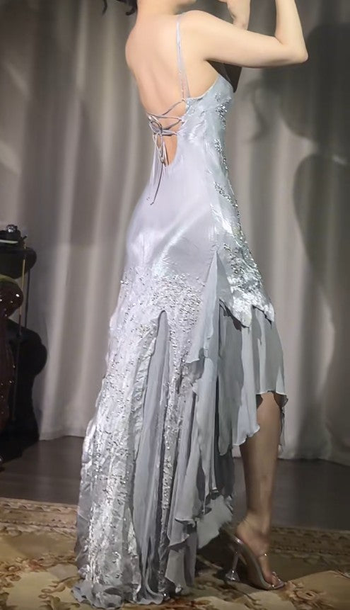 Vintage Silver V-neck Satin Beaded Party Dresses Backless Sexy Prom Dresses HZ1108