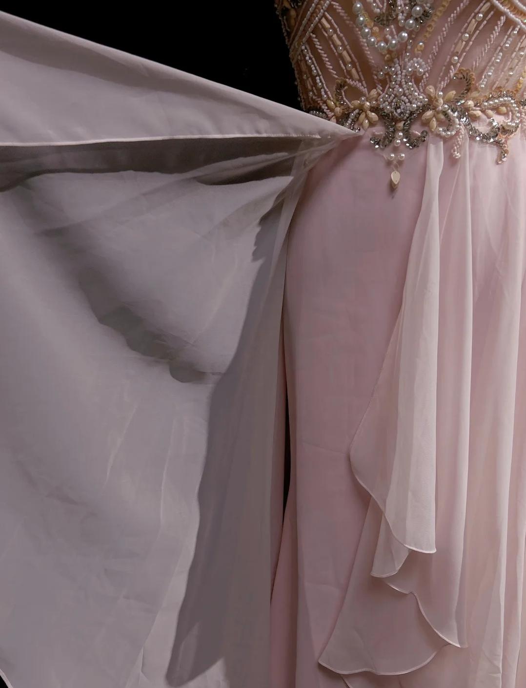 Gorgeous Pink A-Line Tulle High Neck Chiffon Long Beaded Backless Prom Dress Retro Wedding Birthday Dress HZ1108