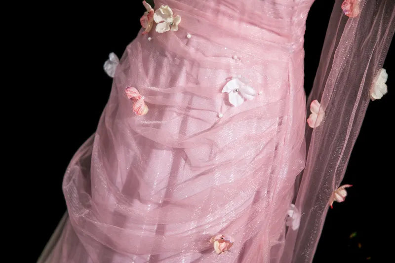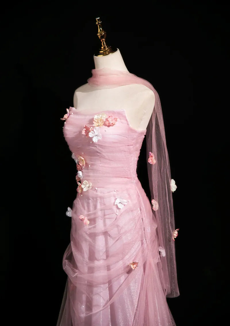 Pink Mermaid Strapless Tulle 3D Applique Long Prom Dress Sweet Wedding Dress HZ1108