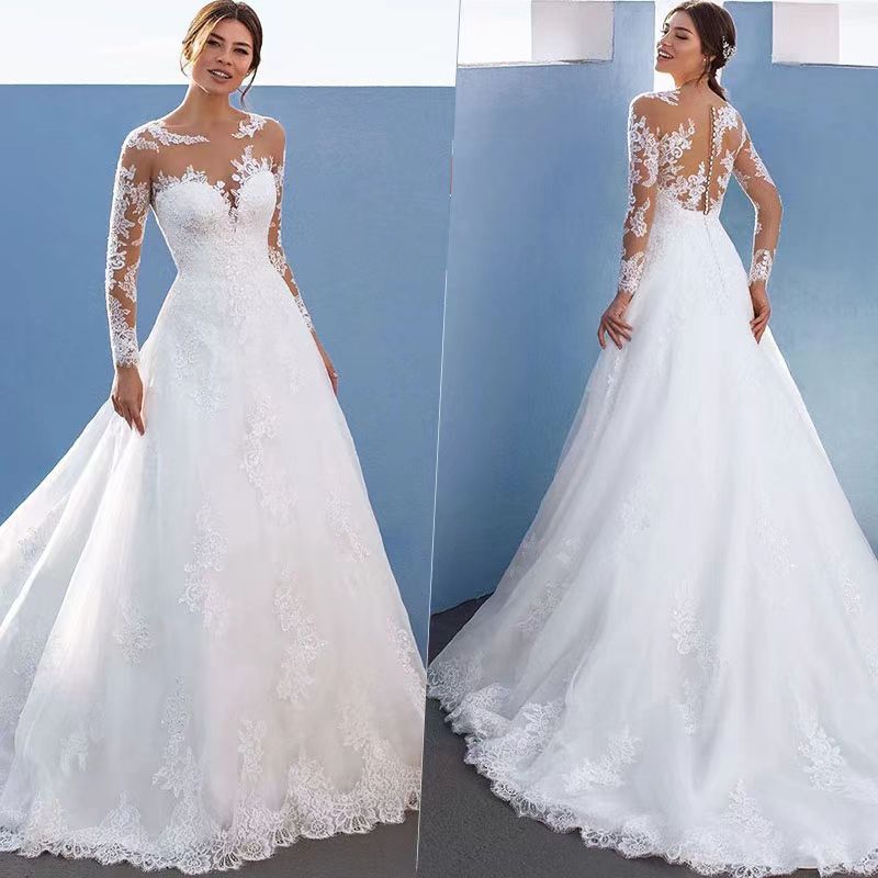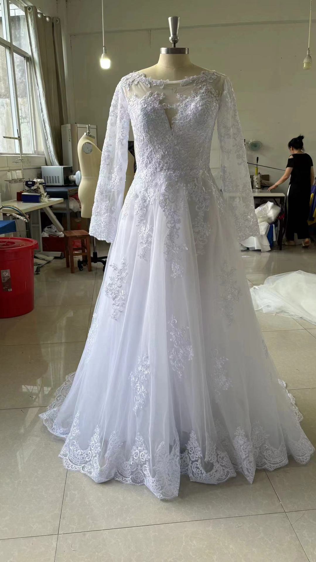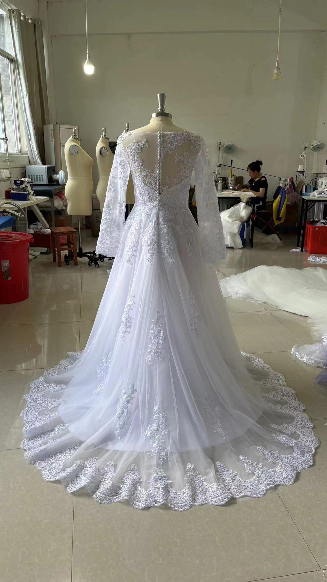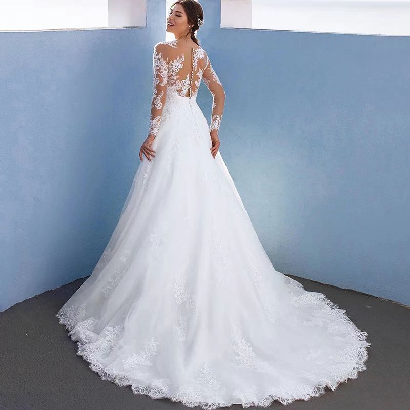 2025 New Main Wedding Dress Bride Big Tail Retro Sexy Thin V Collar Long Sleeve Dress