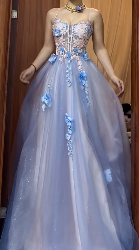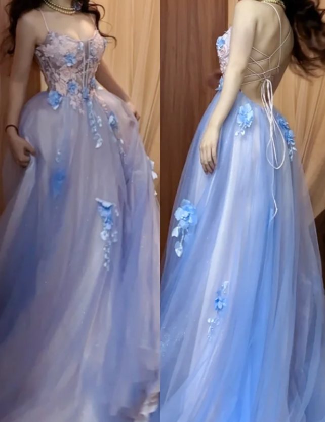 Backless A-Line Spaghetti Strap Tulle Applique Long Prom Dress Sweet Evening Dress HZ1108