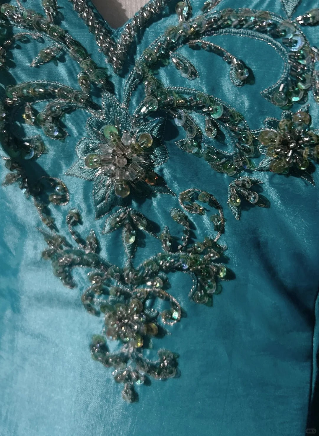 Its beautiful😍More beautiful than in photos and if you have a tail, the size she wears is size 10, clothes are medium size and pants 7 Mexican I hope my comment help you and eye fits brings corset type