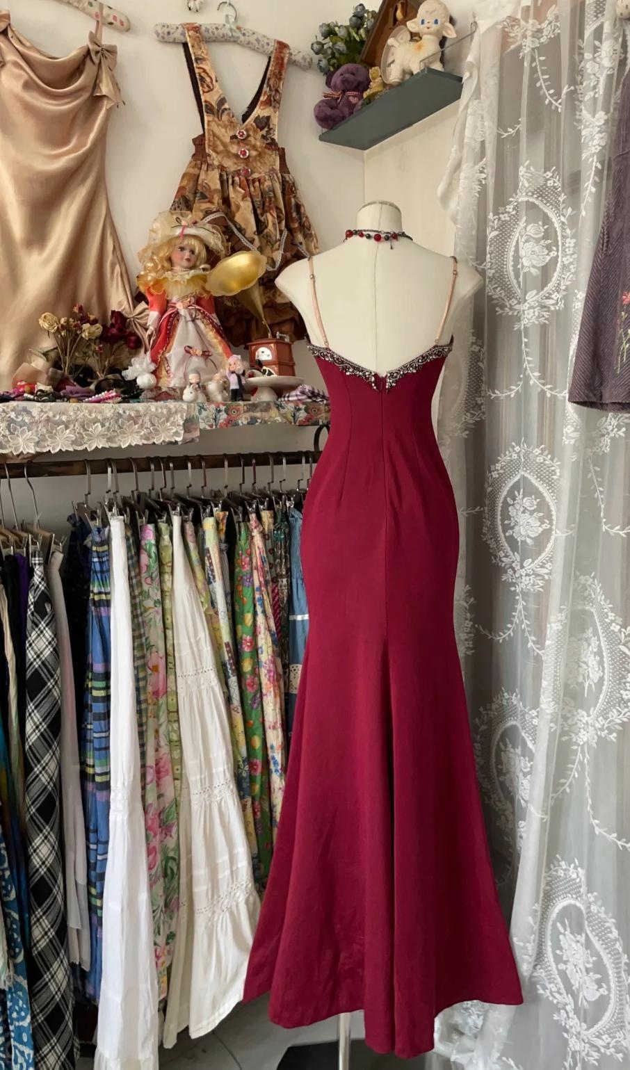 Elegant Red Satin Lace Applique Beaded Long Prom Dress Vintage Spaghetti Straps Mermaid Gowns (Under $200) HZ1108
