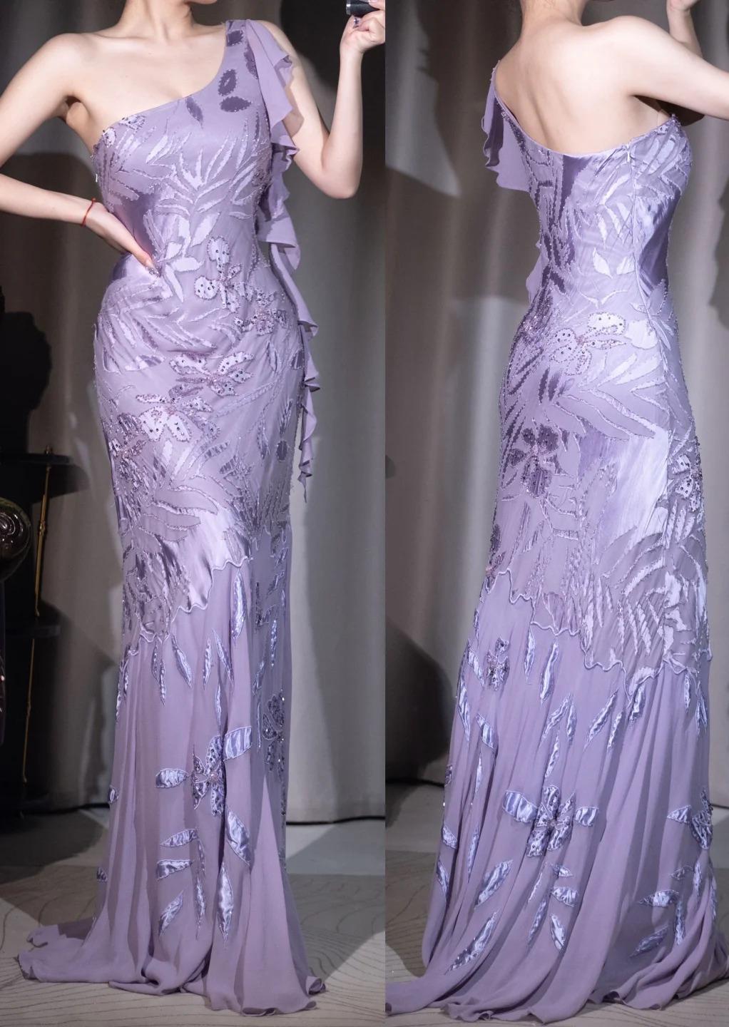 Elegant Vintage Purple One Shoulder Mermaid Chiffon Long Prom Dresses Evening Dresses with Beading HZ1108