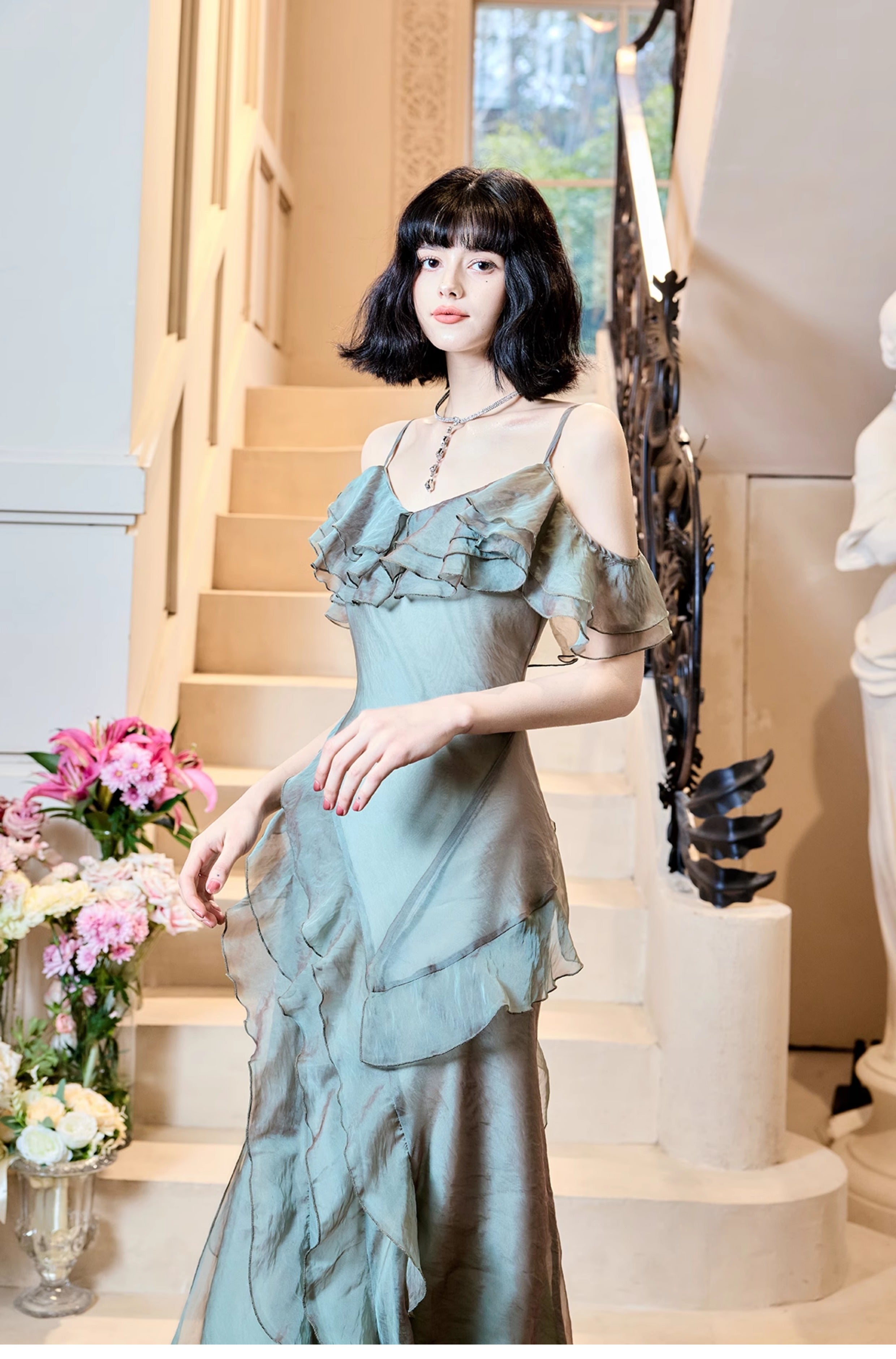 French Elegant Spaghetti Straps Ruffled Tulle Sheath Evening Dress HZ1108