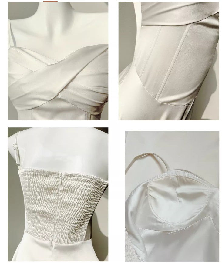 French Light Champagne Spaghetti Strap Satin A-Line Bridal Dress Elegant Wedding Guest Dress HZ1108