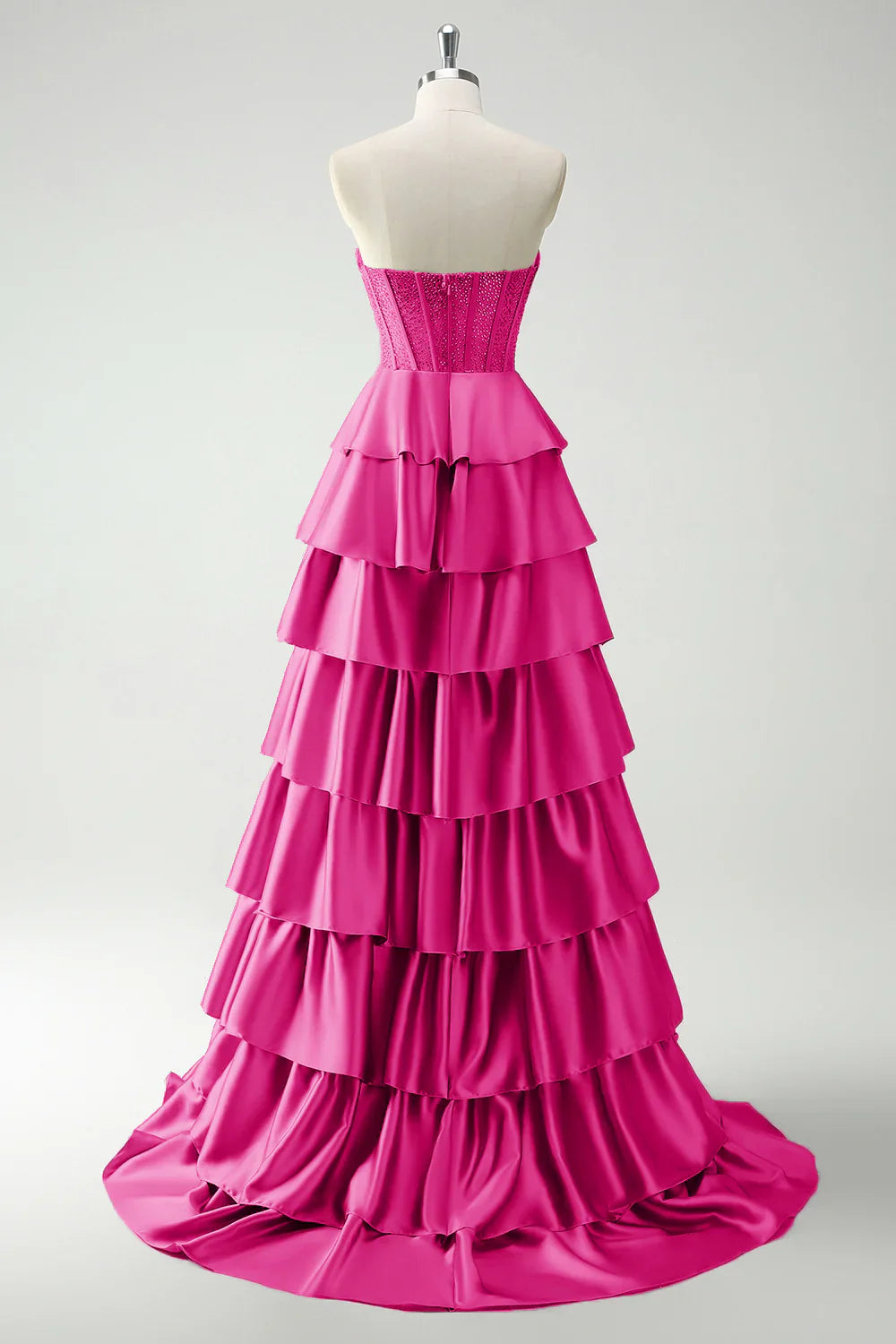 Fuchsia A-line strapless sweetheart neck satin simple long prom dress HZ1108