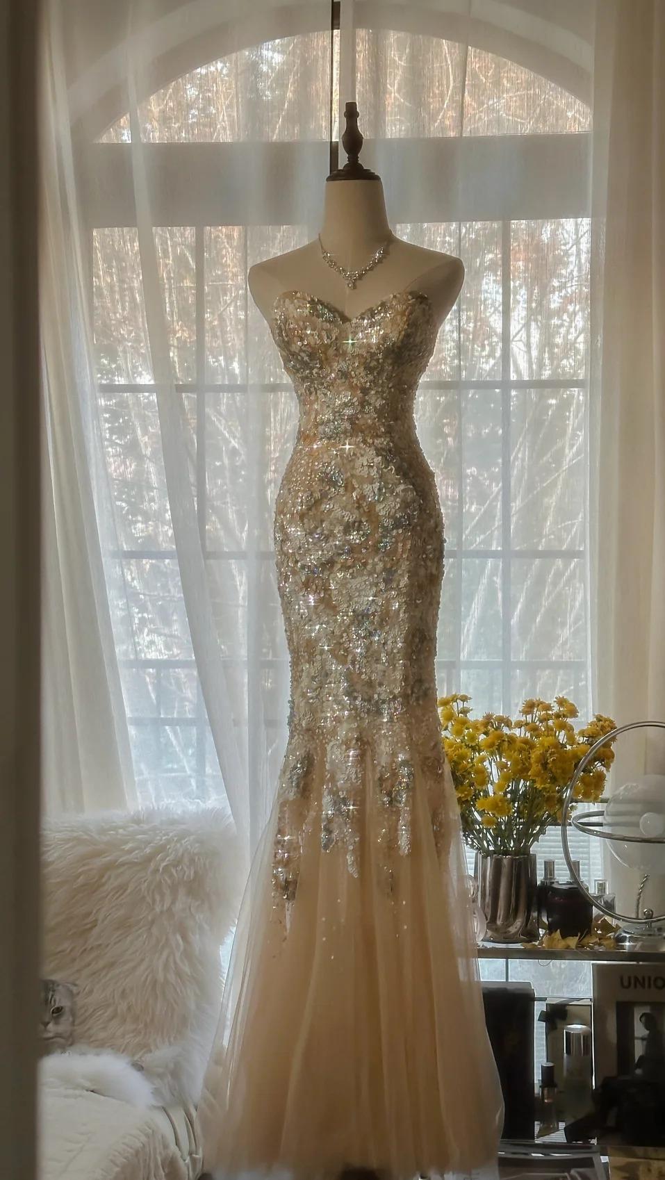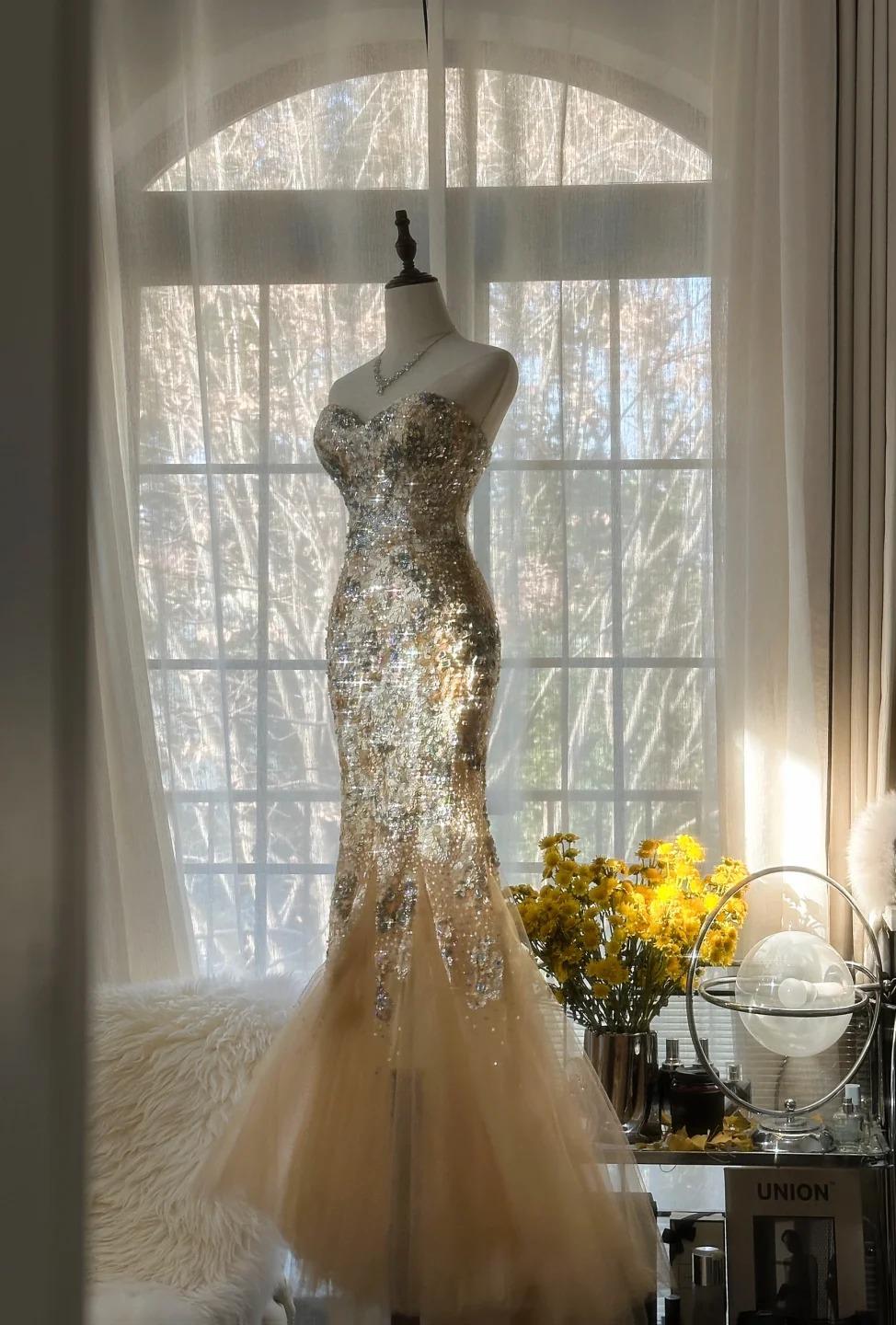 Gorgeous Light Champagne Sweetheart Neck Tulle Sequin Mermaid Long Prom Dresses Elegant Party Dress HZ1108