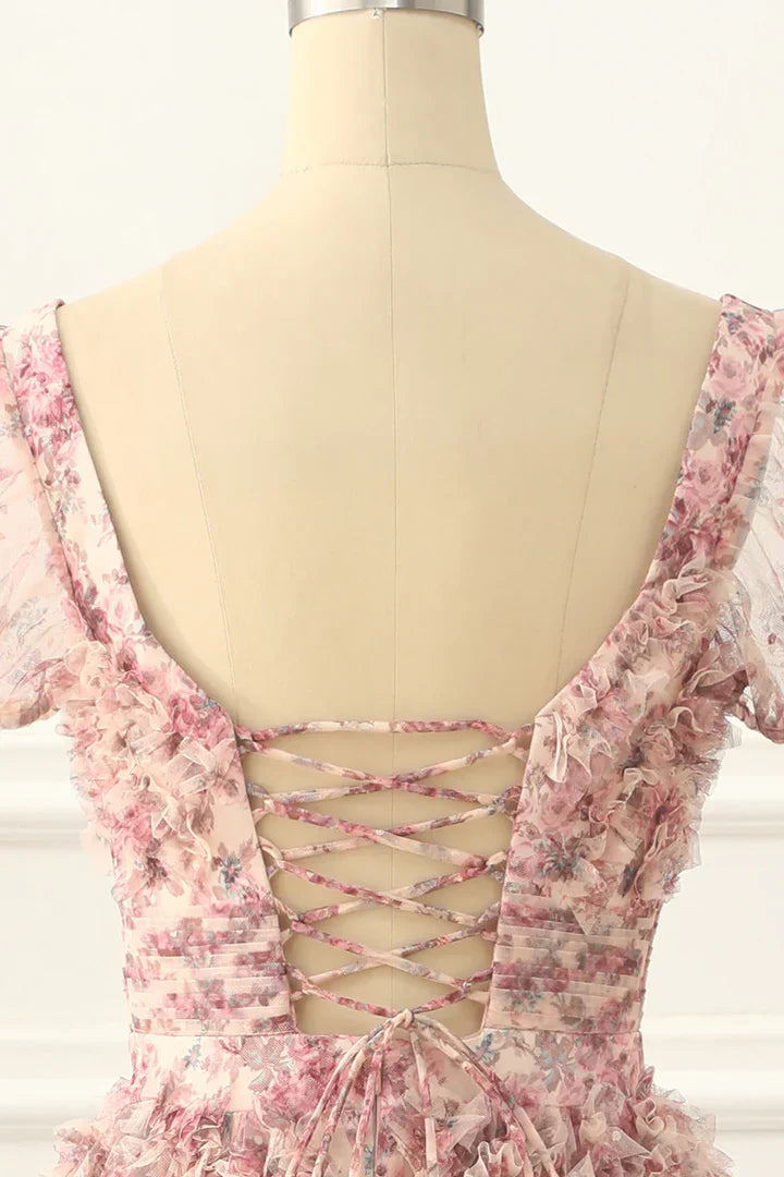 Pink A-line Tulle Pleated Floral Long Prom Dress Adult Ceremony Graduation Prom Dress HZ1108