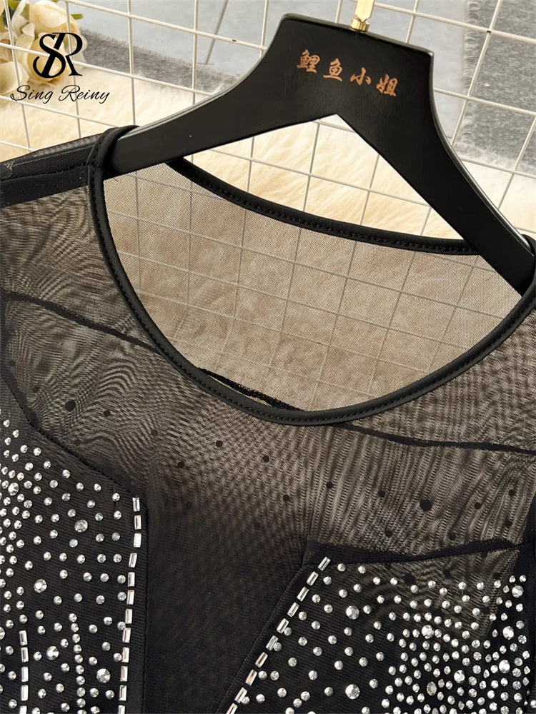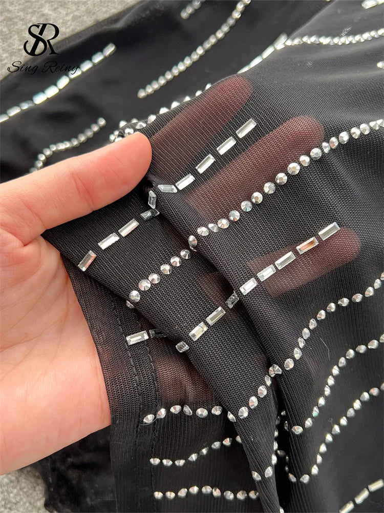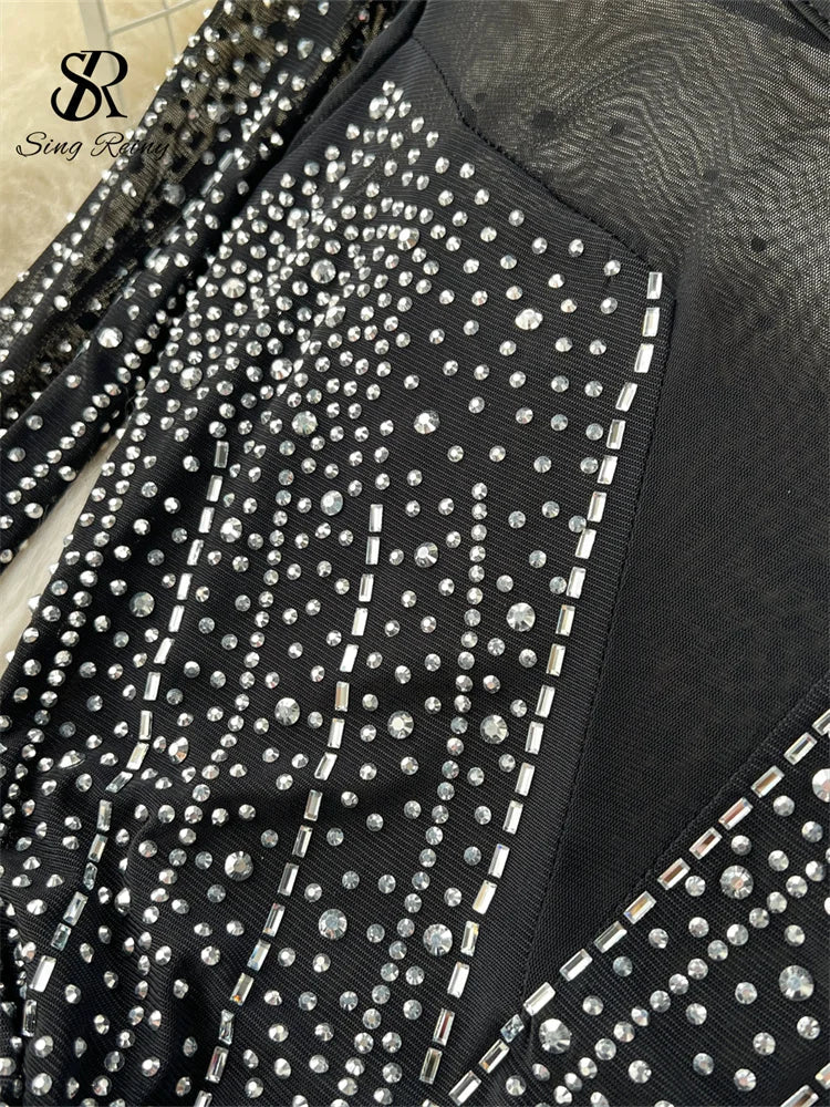 Runhufu 2024 New Fashion Bodycon Long Dress Europen O Neck Long Sleeve Feather Female Senior Mesh Transparent Diamonds Dress