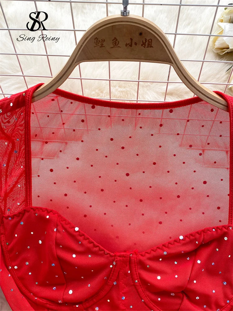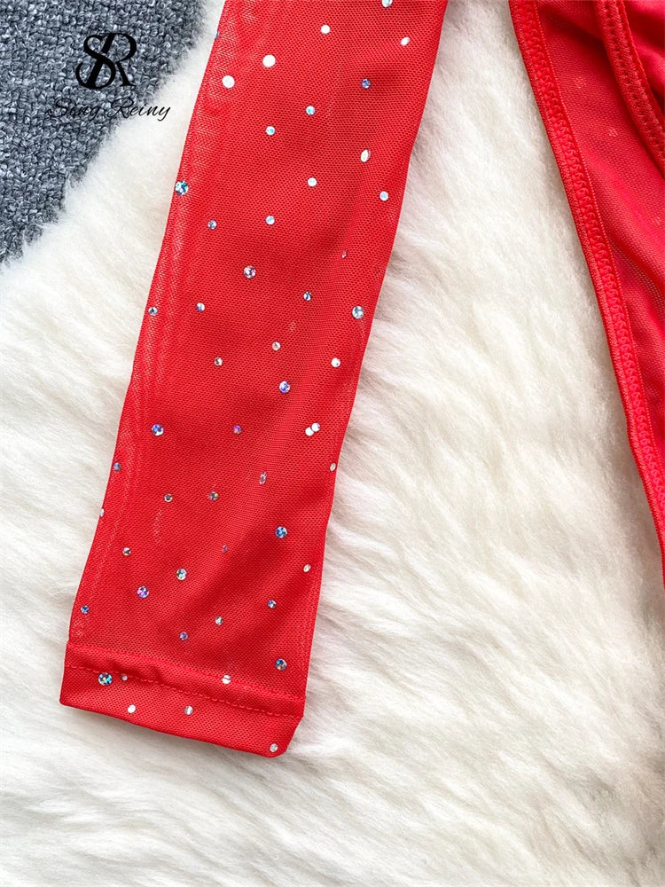 Runhufu 2024 New Spring Diamonds Bodysuits American Long Sleeve Slim Skinny Playsuits Female Sexy Perspective Mesh Rompers