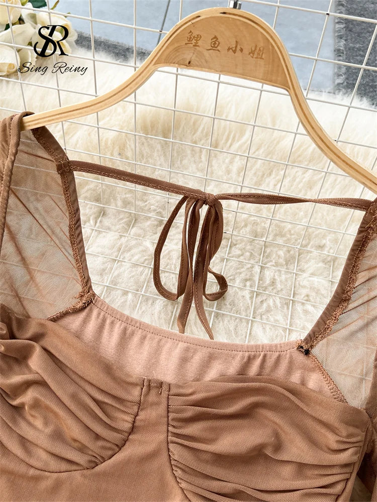 Runhufu 2024 Summer Mesh Split Sexy Dress Ladies Squre Neck Sheer Long Sleeves Transparent Ruched Slim Long Party Dress