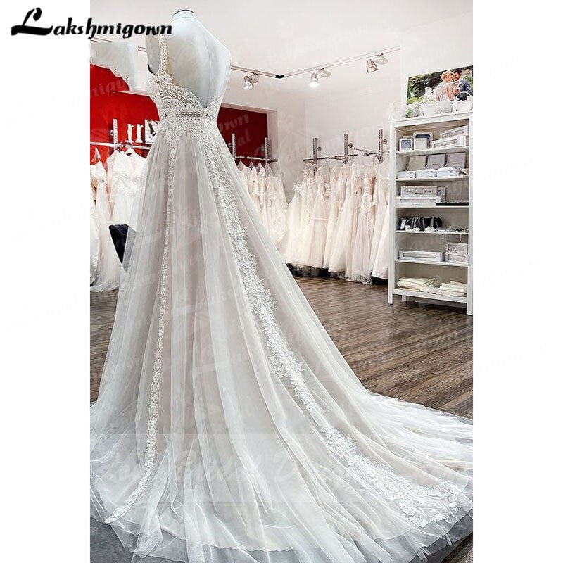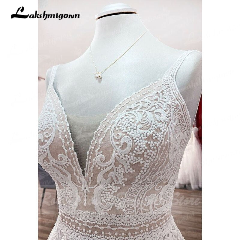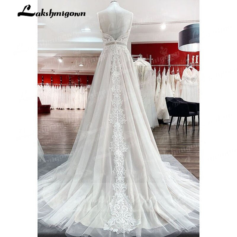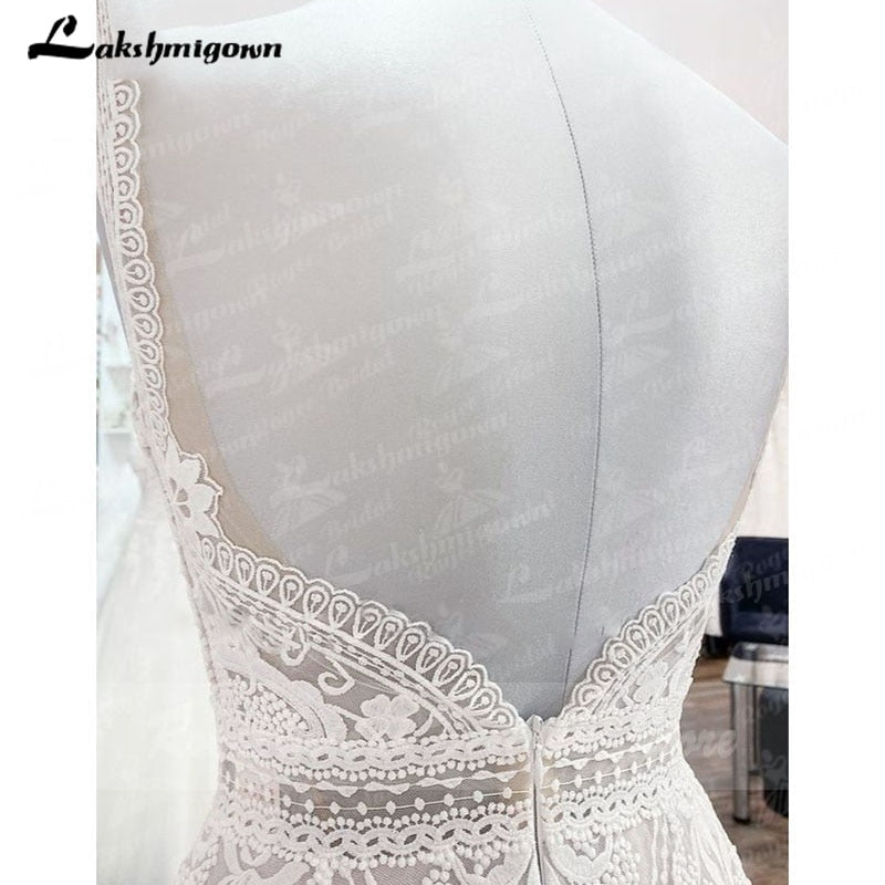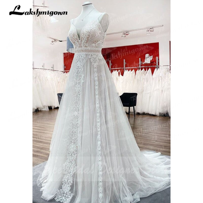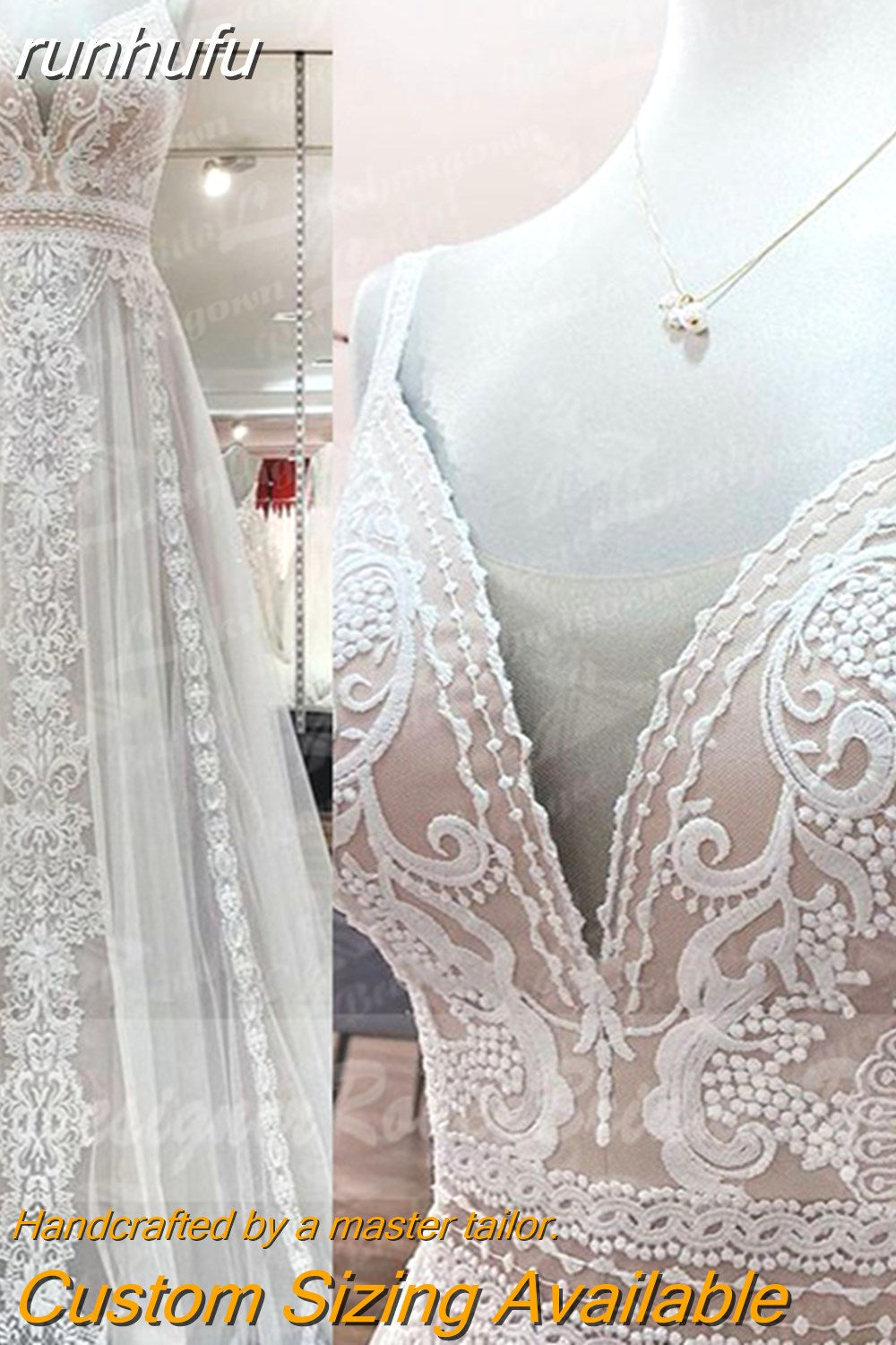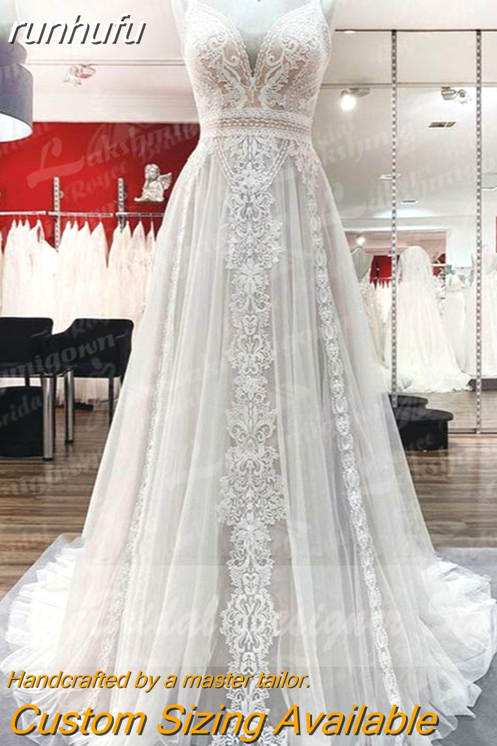 runhufu A Line Boho Wedding Dress Spaghetti Straps Lace Tulle V Neck Sleeveless Open Back Vestidos de Fiesta