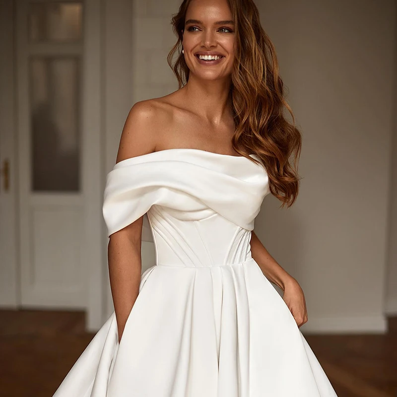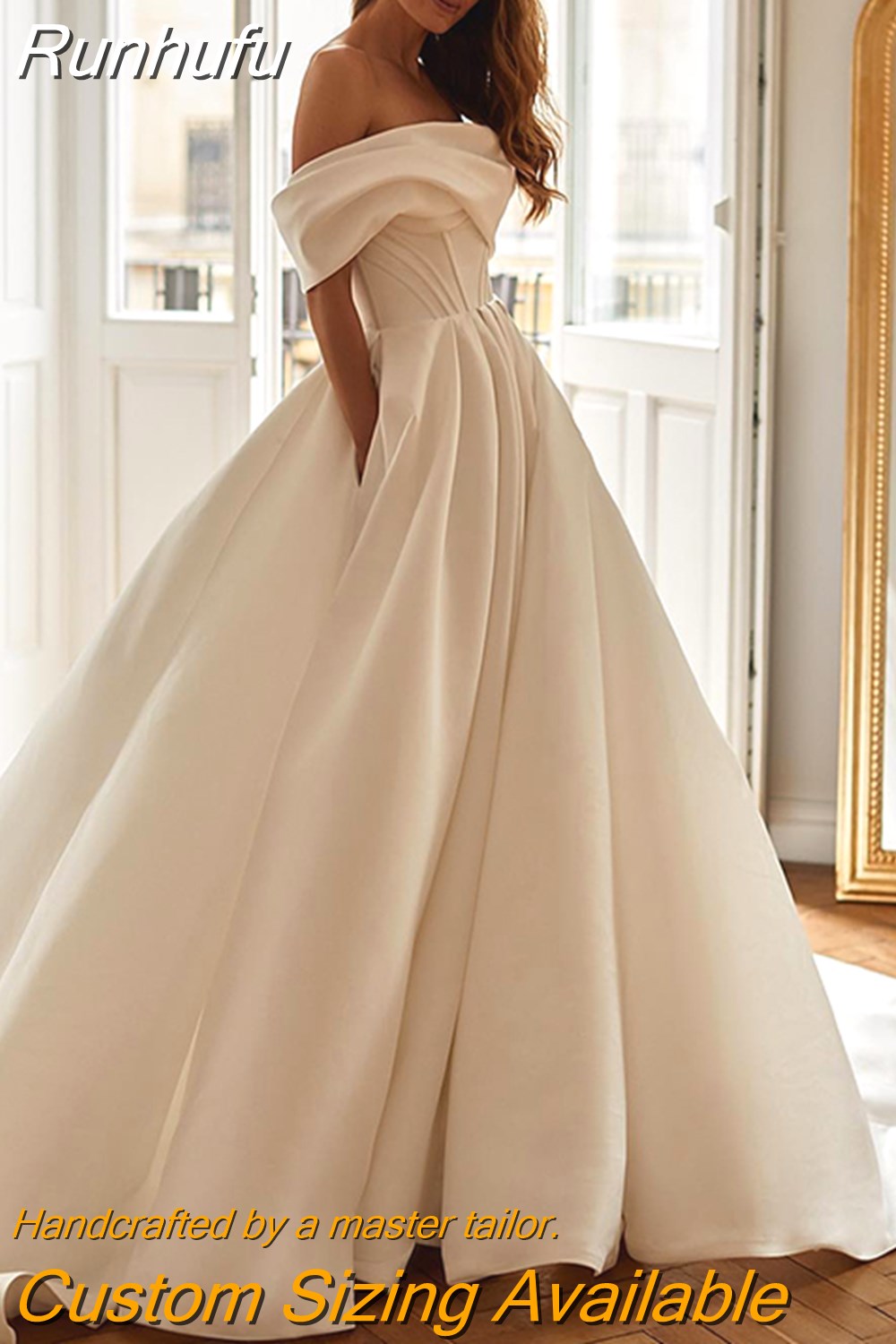 Runhufu A Line Dress Glossy Satin Wedding Dress Off Shoulder Bridal Dress Women Custom Vestido De Novias 2023 Wedding Dress With