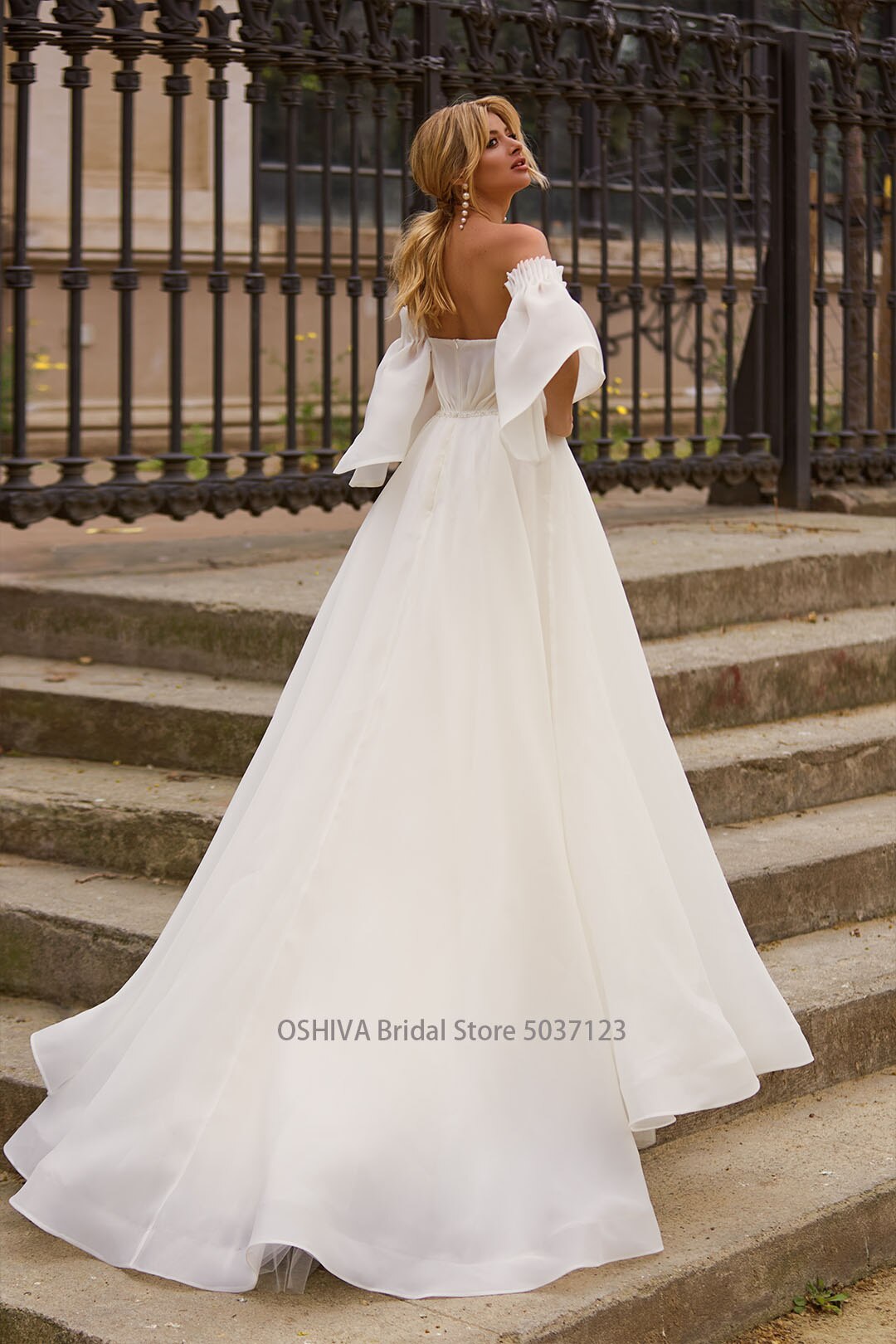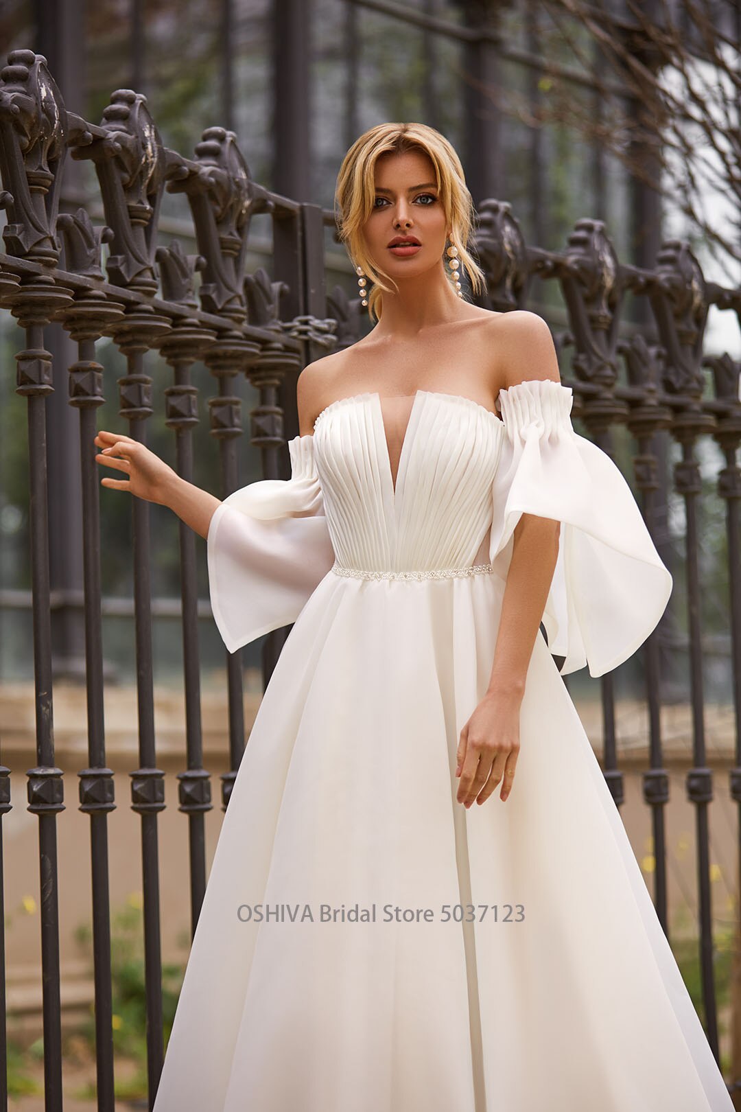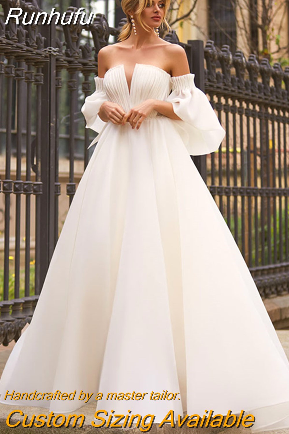 Runhufu A Line Organza Wedding Dresses with Detachable Flare Sleeves Sexy Pleated A Line Floor Length Bridal Gowns