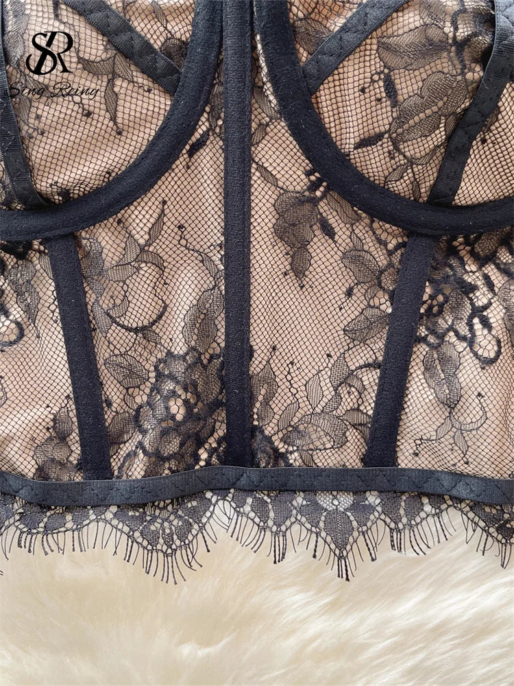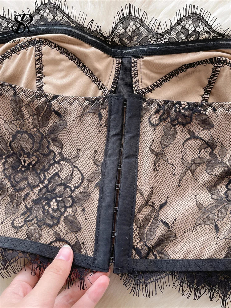 Runhufu American Retro Senior Tank Tops Fashion Sleeveless Slim Floral Corset Female Strapless Mesh Lace Design Sexy Tops