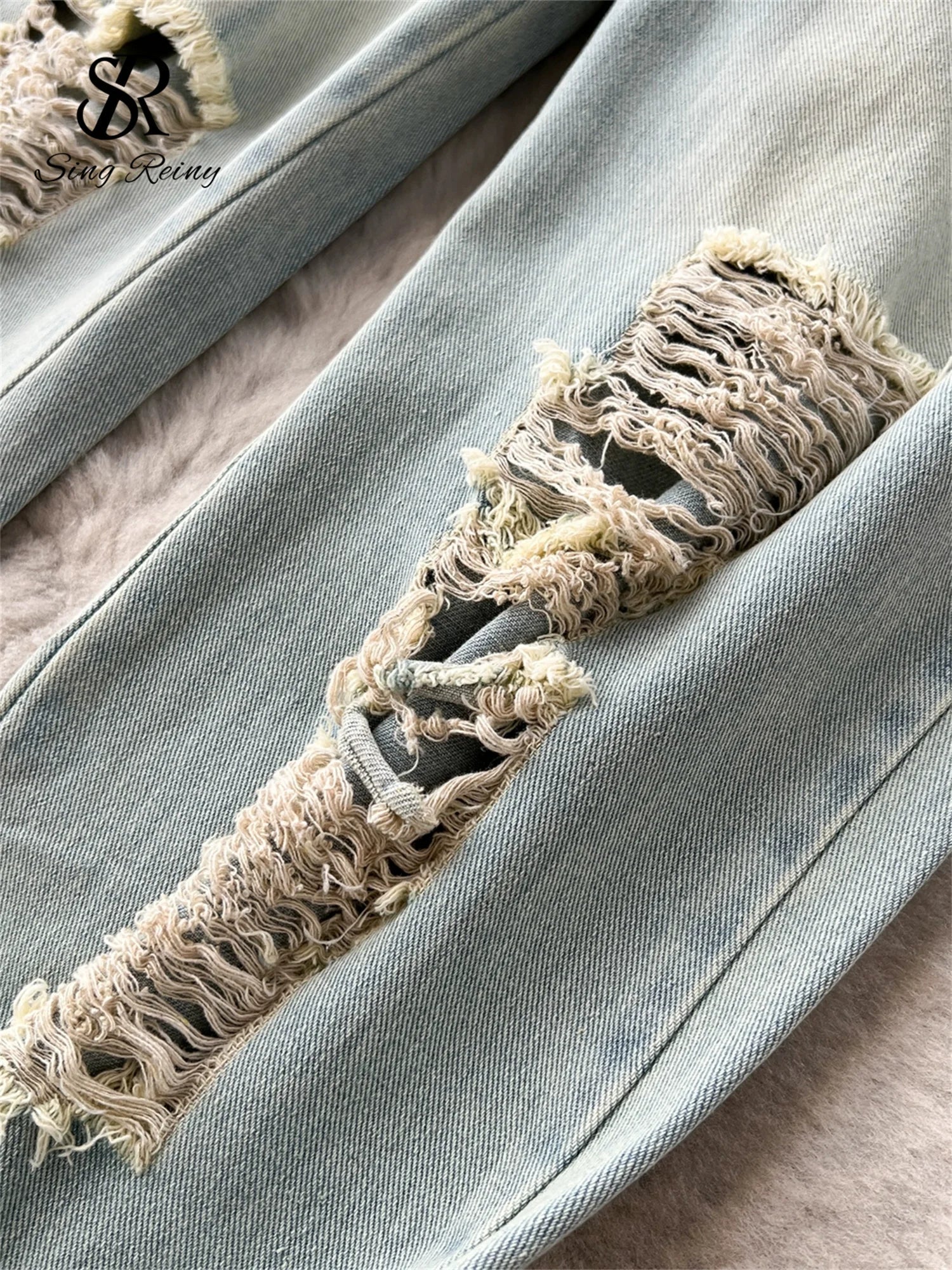 Runhufu American Retro Streetwear Denim Jumpsuits Zipper Pocket High Waist Wide Legs Ripped Pants Summer Women Slim Rompers