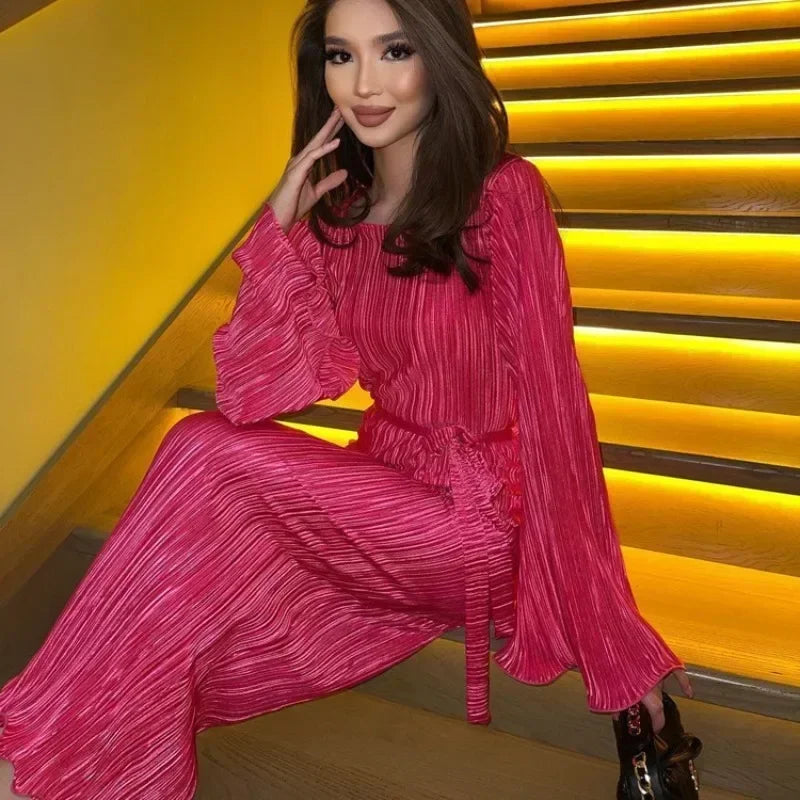 Runhufu and The United States Dresses Women's Models Fall New Round Neck Tie Flare Long-sleeved Long Section Pleated Long Skirt