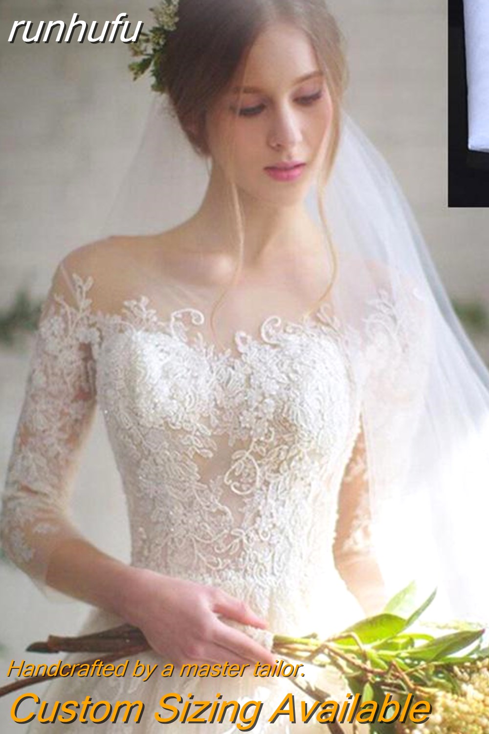 Runhufu NICEB 3/4 Lace Sleeves Wedding Dresses With Pocket Satin Sweep Train свадебное платье Bridal Ball Gowns Simple Customized