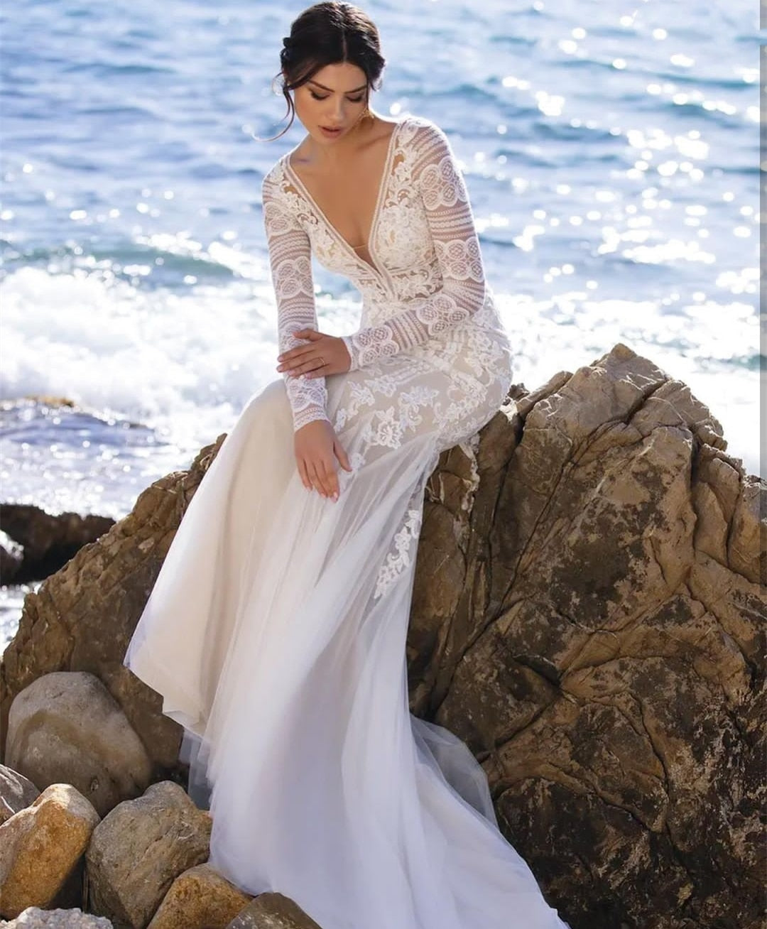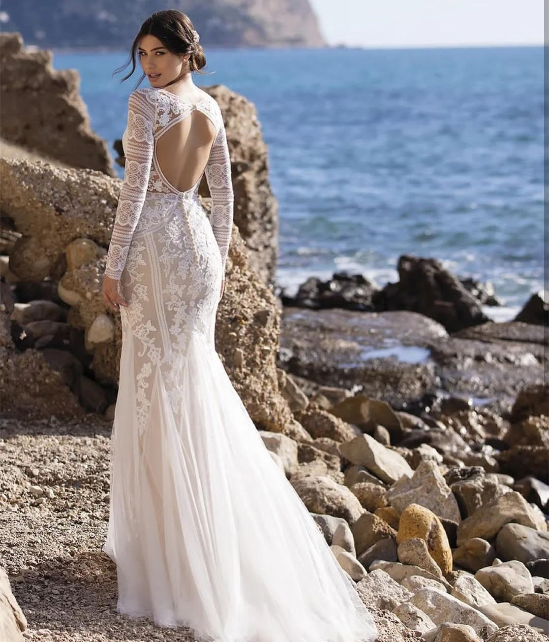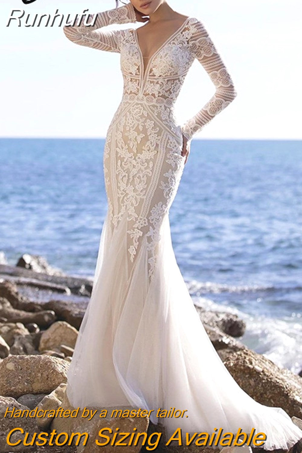 Runhufu Beach Mermaid Wedding Dress Long Sleeve V-Neck Lace Appliques Sexy Open Back Tulle Bride Gown Train Vestidos De Noiva
