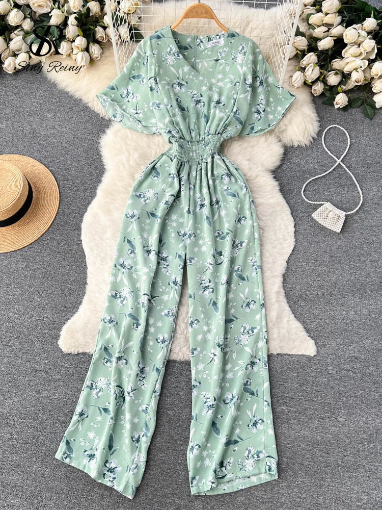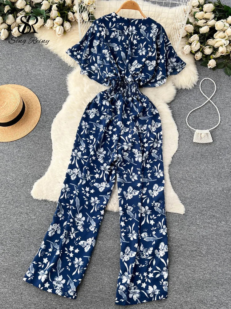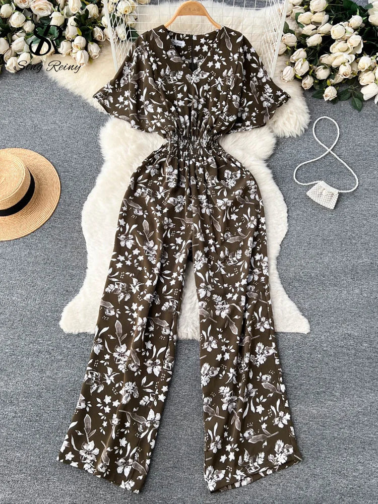 Runhufu Beach Summer Floral Jumpsuits Fashion V Neck Elastic Slim Short Sleeve 2024 Streetwear Vacation Retro Long Rompers