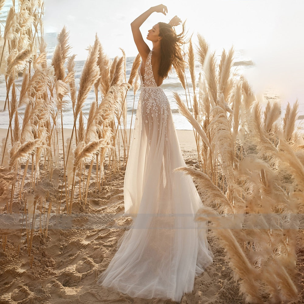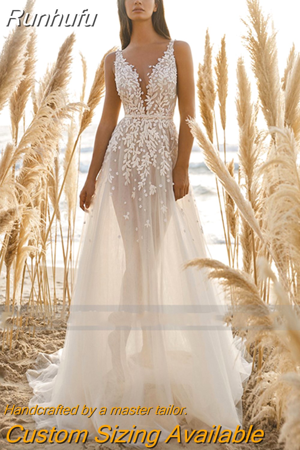 Runhufu Bohemian Wedding Dresses Lace Applique Women's Sexy Deep V-Neck Sleeveless Bridal Gowns Thin Beach Party Princess Robe