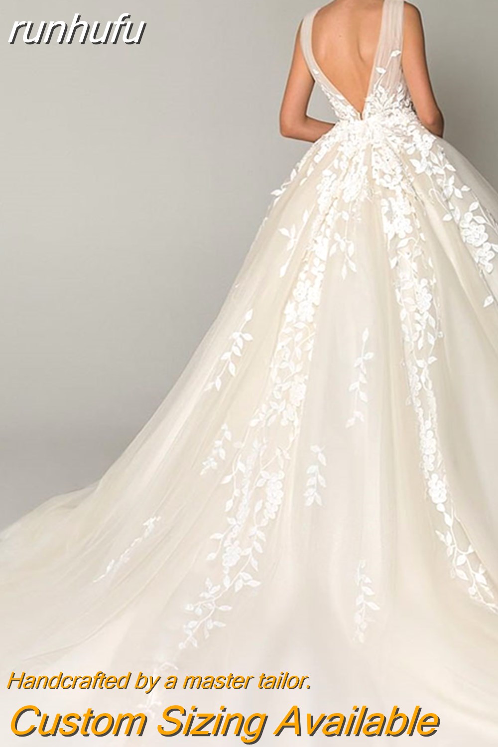 runhufu Boho Princess Wedding Dress Lace Appliques Sexy Backless V Neck Beach Bridal Dress Sleeveless Bridal Gowns