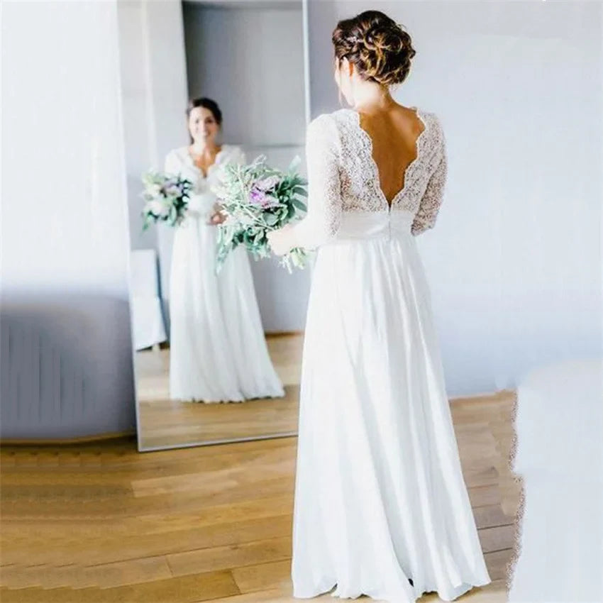 Runhufu Boho Wedding Dress 2023 Deep Lace Top V-neck 3/4 Sleeves Backless Beach Women Bridal Gowns Vestidos de novia