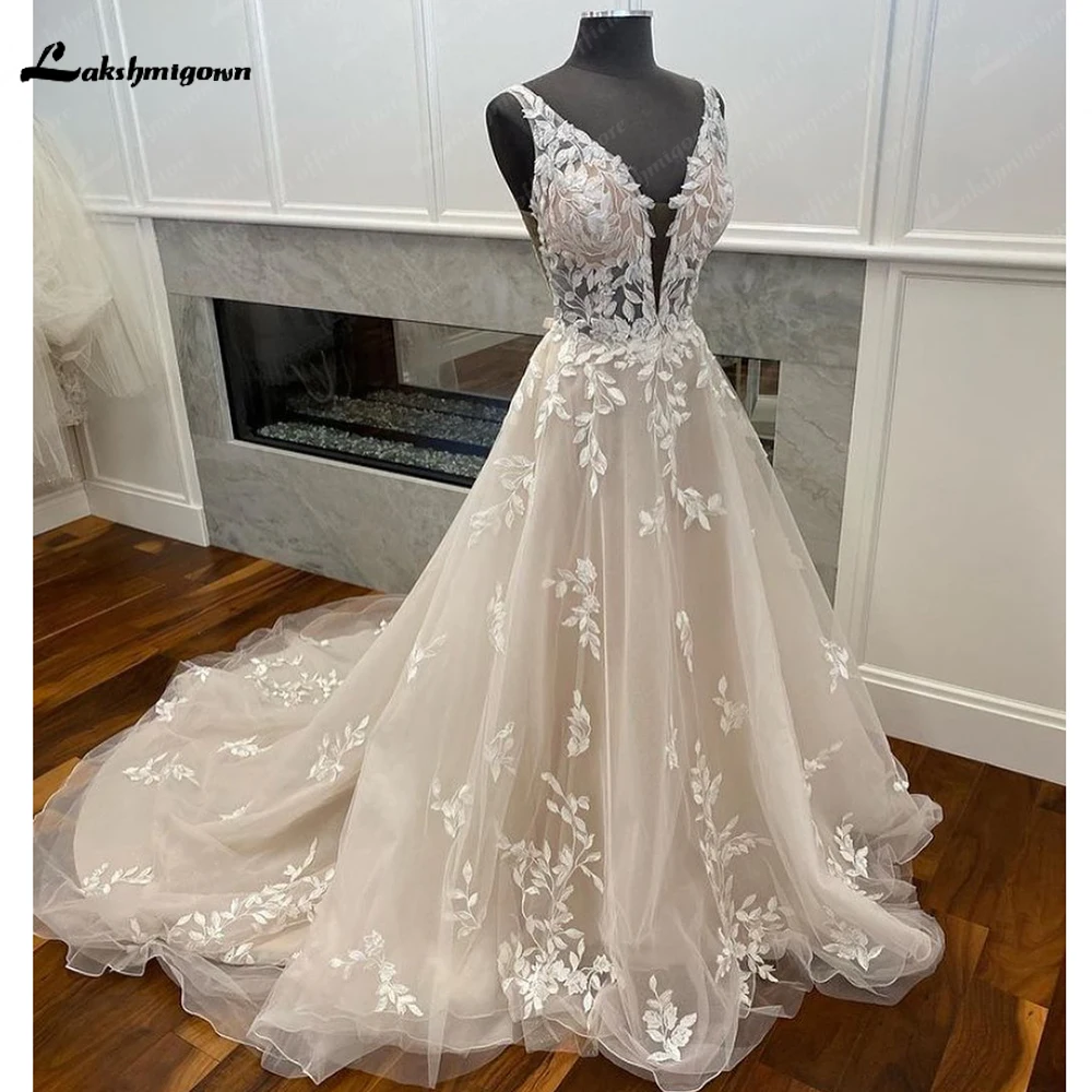 runhufu Champagne Boho Wedding Dress 2023 Lace Appliques Tulle Long Bridal Beach Wedding Gowns vestido de casamento princesa