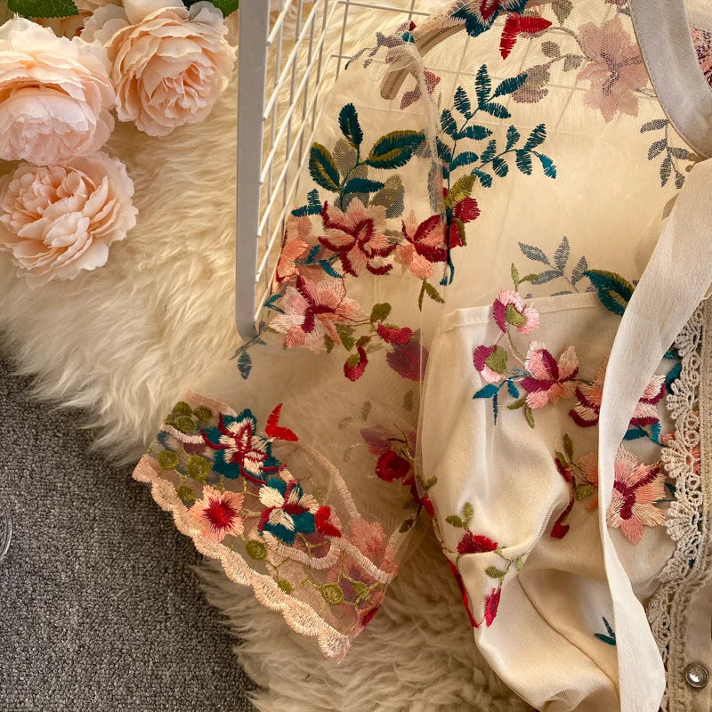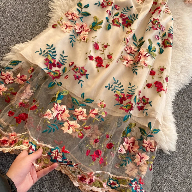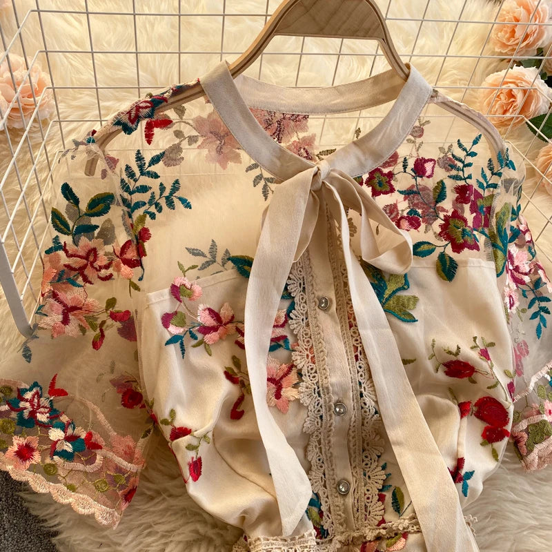 Runhufu Chic Mesh Embroidery Flower Dress Women French Bow Collar Short Sleeve A-line Dress Summer Elegant Retro Holiday Dress