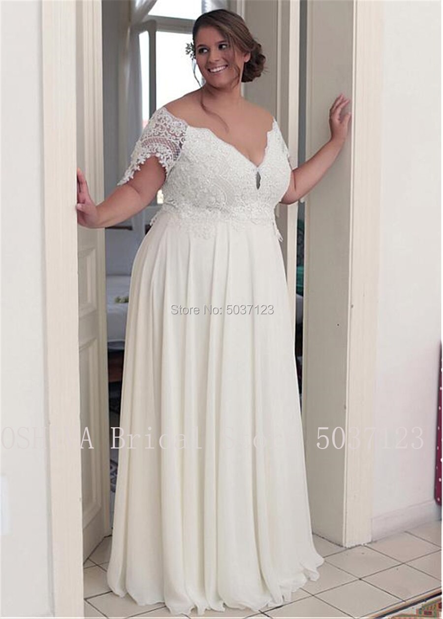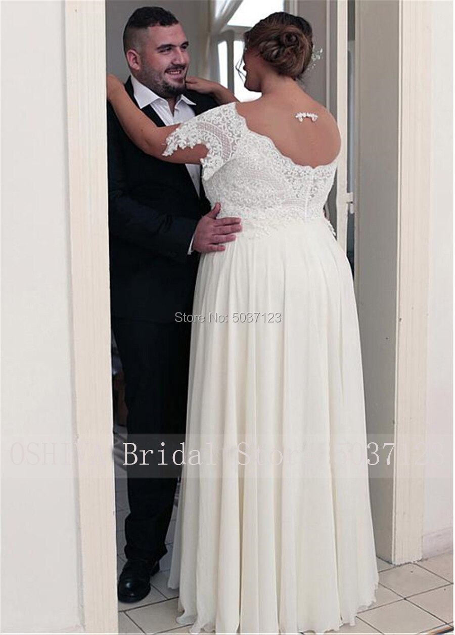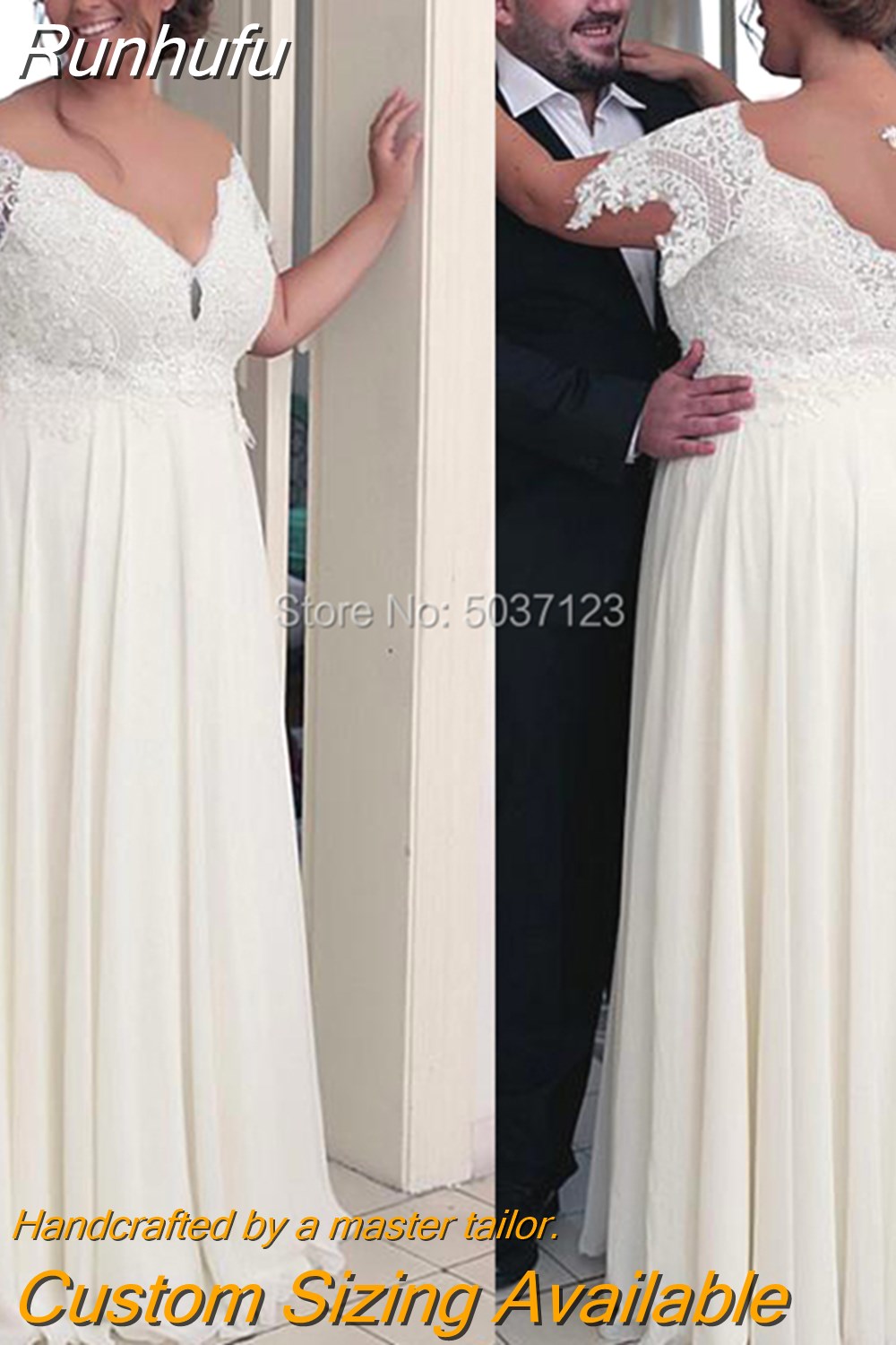 Runhufu Chiffon Jewel Neckline A-line Wedding Dresses With Beaded Lace Appliques Short Sleeves Plus Size Bridal Gown Robe de Long