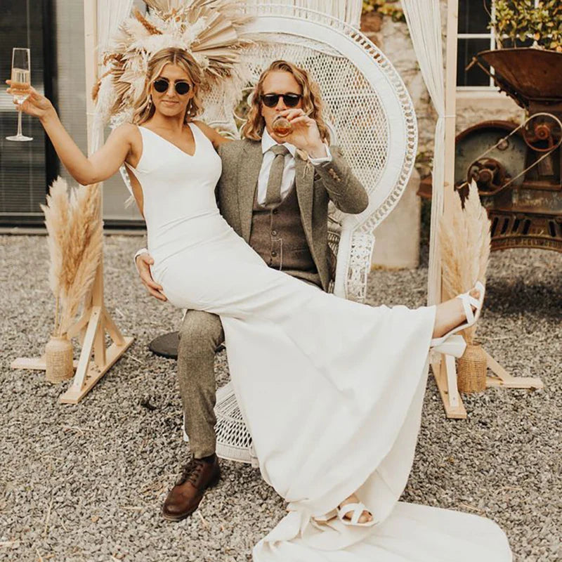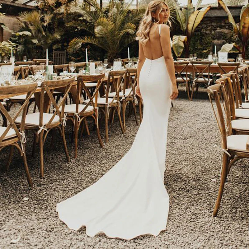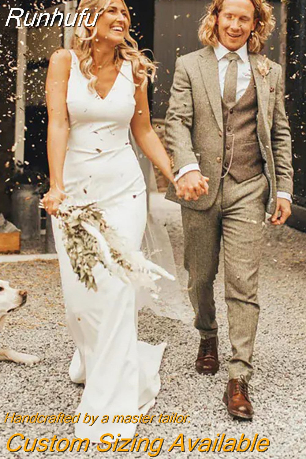 Runhufu Crepe Open Back Wedding Dress Drop Ship Custom Made Simple Sheath Satin Ivory Minimalist Sexy V Neck Bridal Gowns