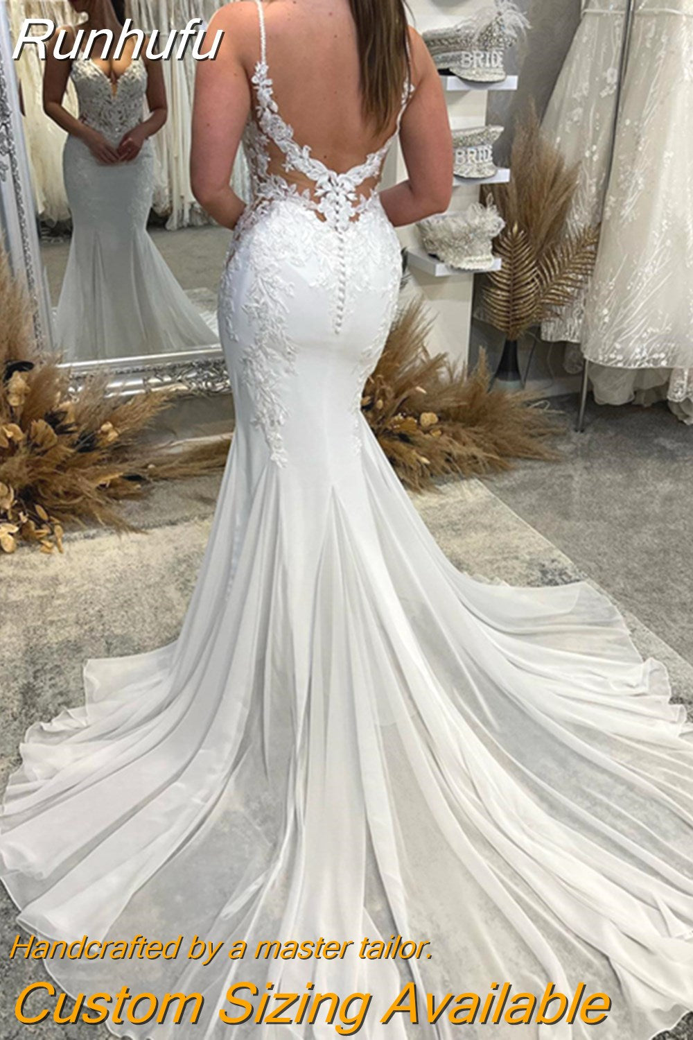 Runhufu Deep V-Neck Sleeveless Crepe Mermaid Wedding Dress Simple Spaghetti Strap Court Train Cut Out Back Bridal Gown Custom Made