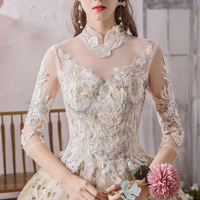 Runhufu Dress 2023 Muslim Half Sleeve High Neck Lace Up Ball Gown Princess Champagne Vintage Wedding Dresses Hs778
