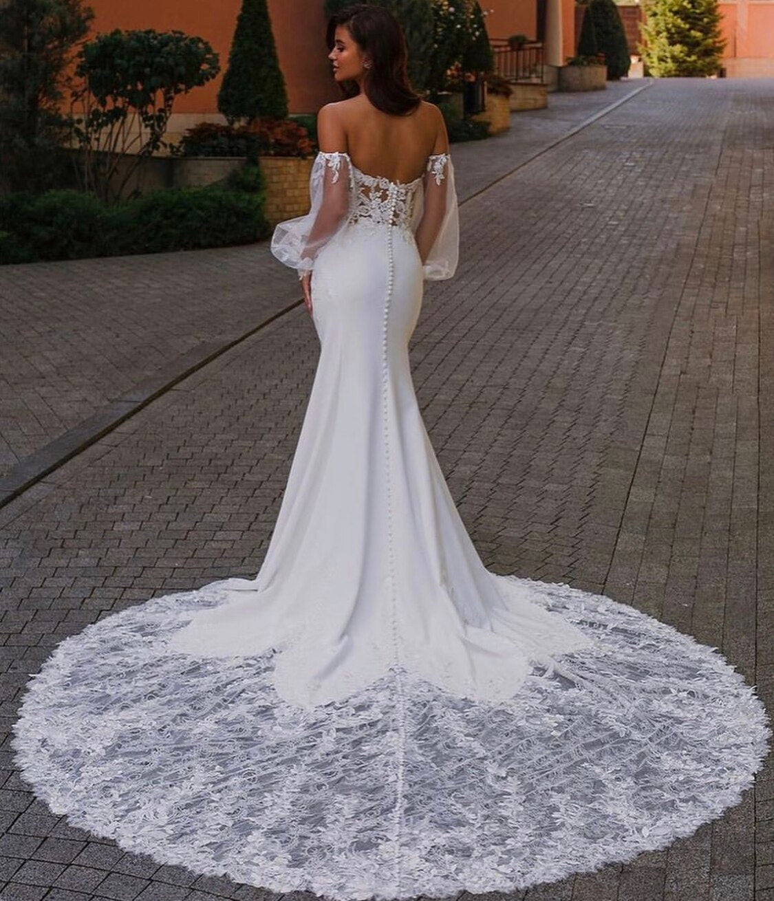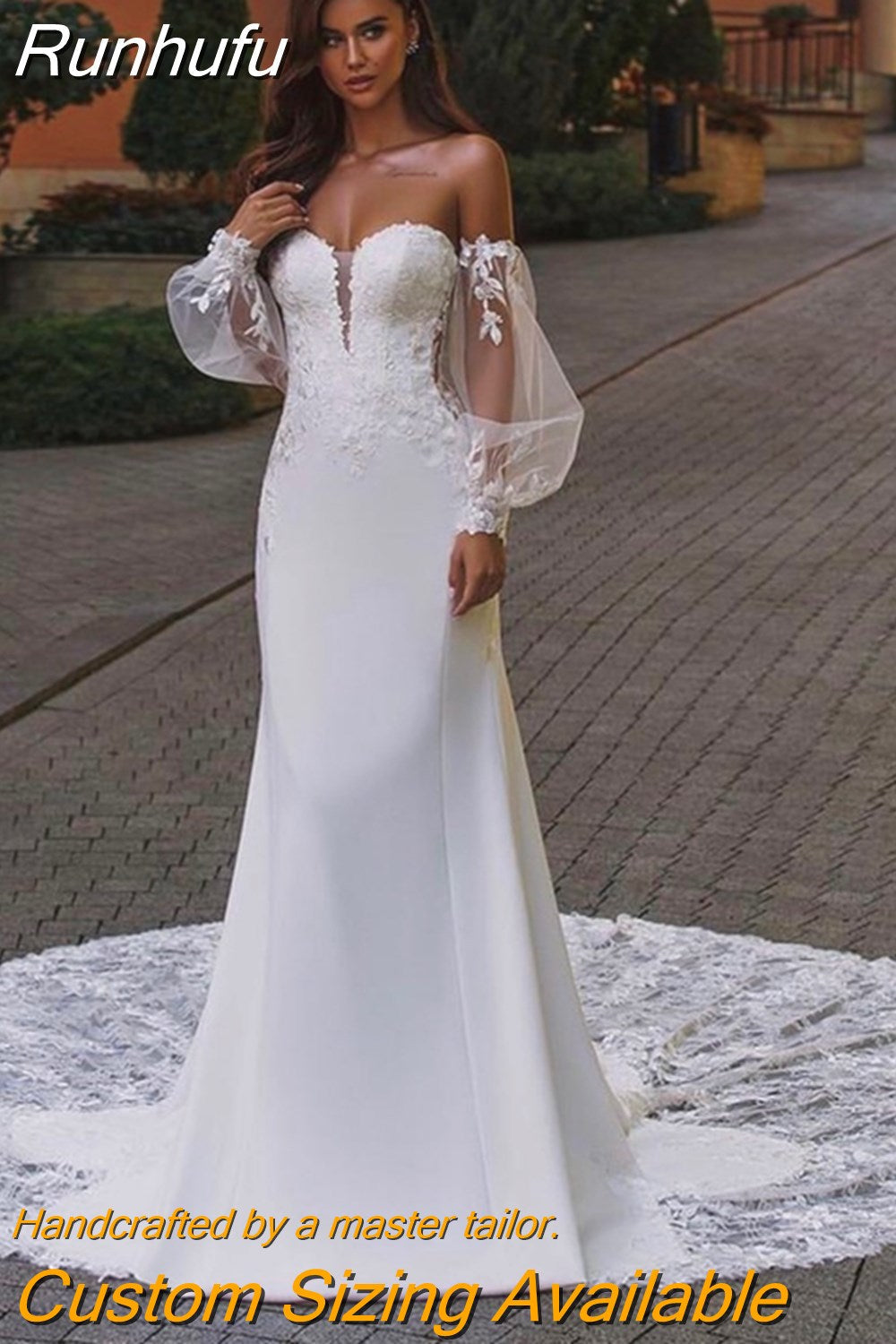 Runhufu Dress Mermaid Sweetheart Lantern Sleeve Lace Appliques Sequined Beads Backless Floor Length Sweep Train Bride Gown 2023
