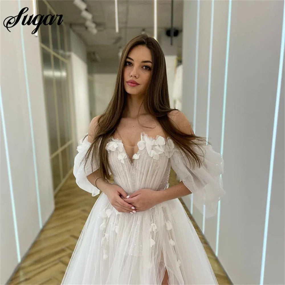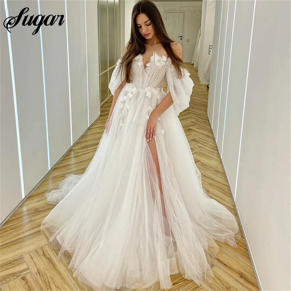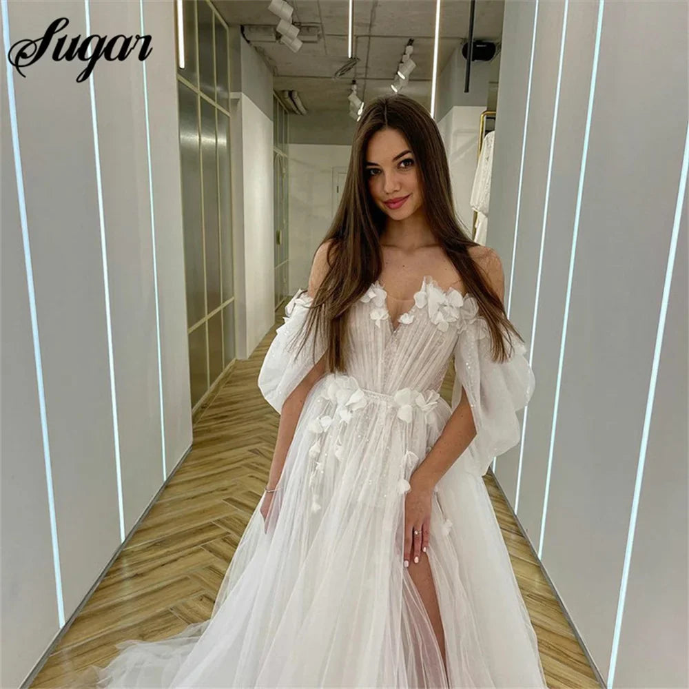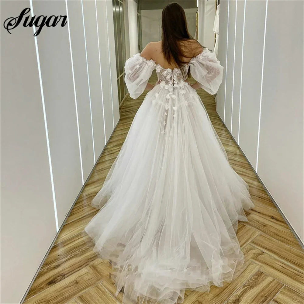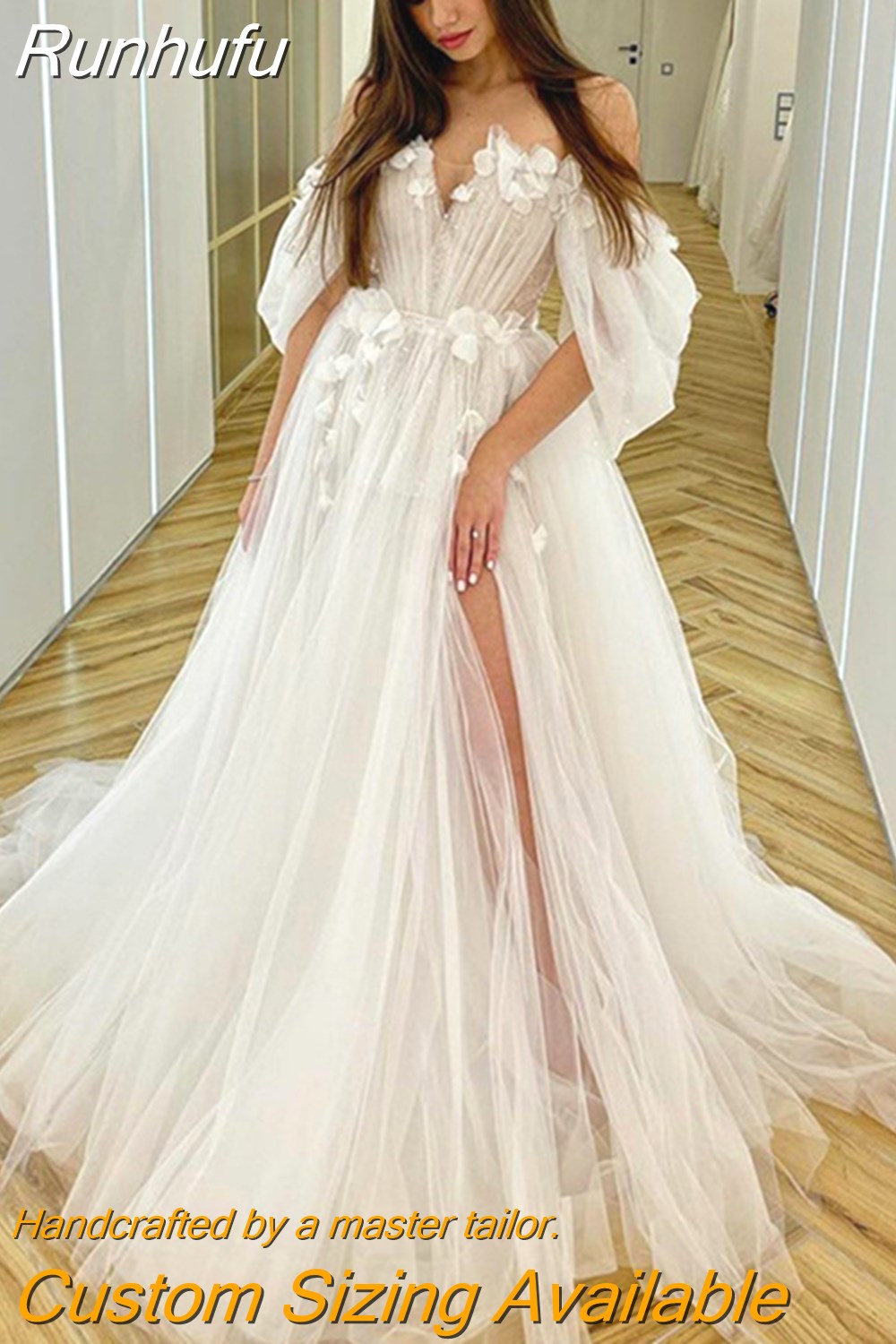 Runhufu Dresses Fairy Sweetheart Neck Boho Bride Dresses 3D Flowers Puff Sleeve Elegant Wedding Gowns suknia ślubna Bridal Gown