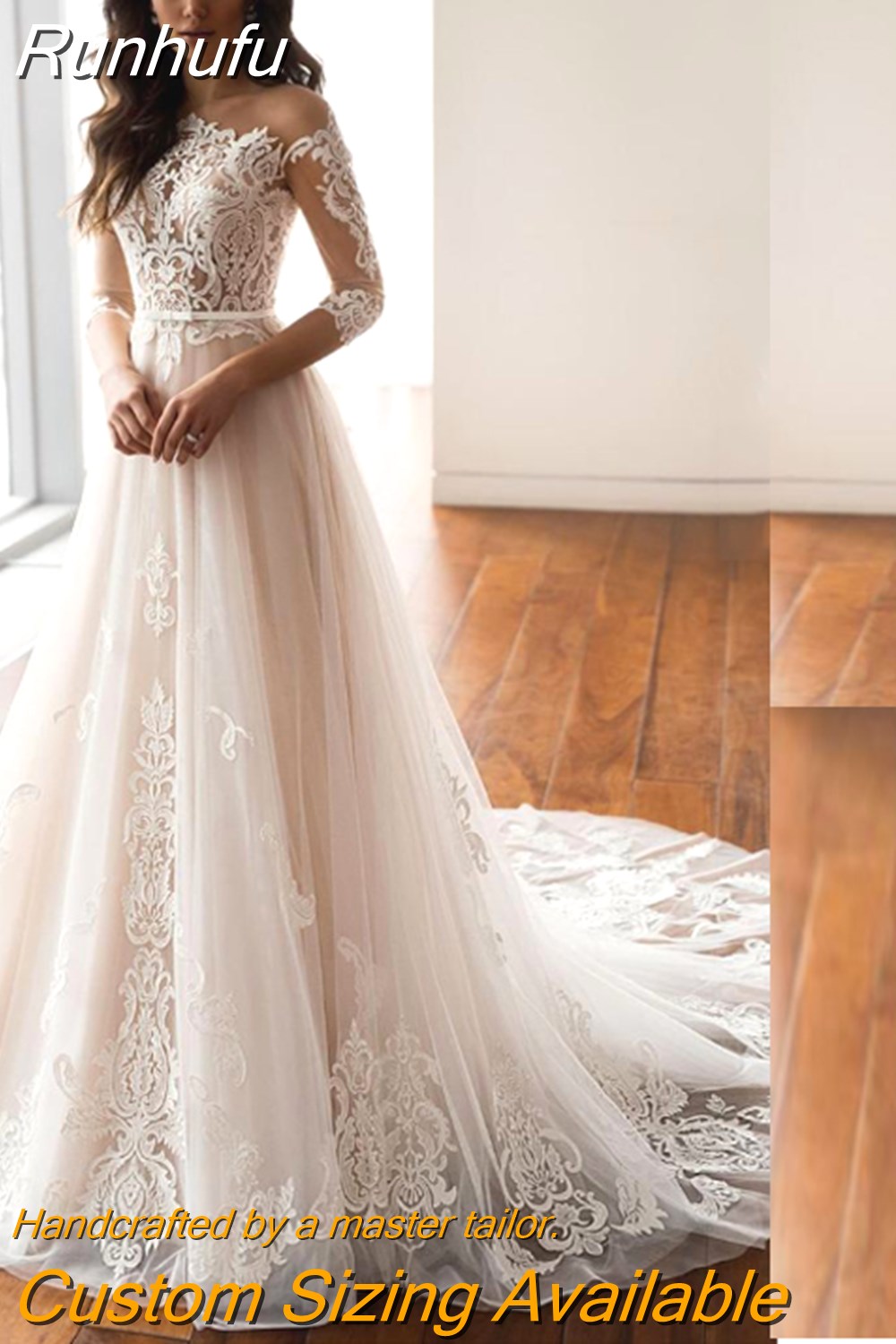 Runhufu Elegant 3/4 Sleeve Wedding Dress 2023 A-Line Lace Appliques Button Belt Train Tulle Bridal Gown Vestidos De Noiva